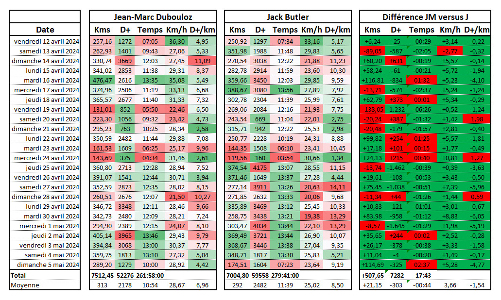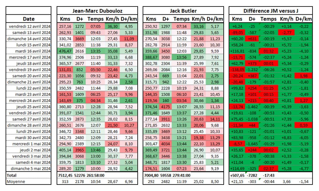 Au lendemain de l’arrivée, le temps d’un déjeuner, nous avons pris le temps de revenir avec eux sur les temps forts de cette édition exceptionnelle. Voilà la synthèse de ces analyses à chaud, en commençant par un tableau factuel tiré de leur compte Strava. Merci à notre ami belge Claude Brouir pour ce beau travail !