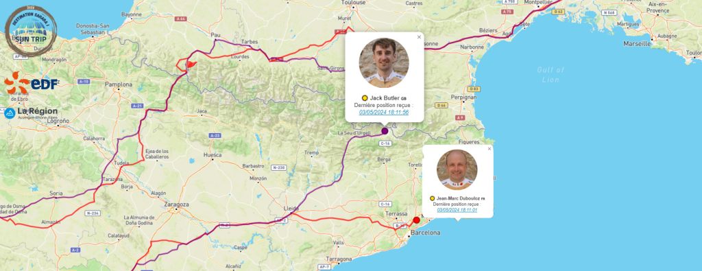 Le 30 avril, les deux champions retrouvent les routes espagnoles. Jean-Marc fait un détour vers Séville et semble reprendre immédiatement une centaine de kilomètres d’avance ! “J’étais fatigué ce jour là, à cause des efforts de la veille, mais j’ai fait la journée en pensant à la suite” nous dit Jack. Et la suite, c’est une couverture nuageuse qui va progressivement s’installer dans le centre du pays, doublée d’un vent de côté et parfois de grosses pluies. A ce jeu là, le vélomobile de Jean-Marc décroche ! Le 1er mai Jack reprend la tête en arrivant à garder la ligne la plus directe. Il se fait rattraper mais arrive à rester à distance raisonnable quand, le 3 mai, les Pyrénées réapparaissent. “J’avais une heure d’avance sur Jack et j’ai pris l’option d’aller vers Barcelone. Je pensais que le passage par les montagnes était trop difficile, mais je me suis aperçu après coup que non ! Finalement, je me suis retrouvé dans le trafic de fin de journée dans la banlieue de Barcelone, un enfer. J’ai fait 400 km ce jour là mais Jack me reprend 60 km. Il a fait un coup de maître, c’est beau qu’il gagne sur un pari comme ça, bravo champion !”