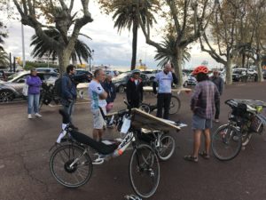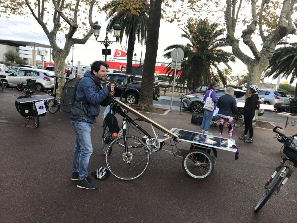 Je suis parti avec mon cruzbike silvio équipé d’un kit OZO roue AR réducté 1200w 48V avec un panneau solaire 110WC en « carénage » et 170 Wc sur la remorque. Le panneau en « carénage » s’est révélé très protecteur contre la pluie et le froid sur les étapes en altitude. Ayant peu roulé en 2 roues couché avant le départ, beaucoup ont souri de me voir zigzaguer en essayant de dompter ce vélo capricieux.
