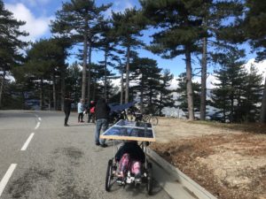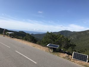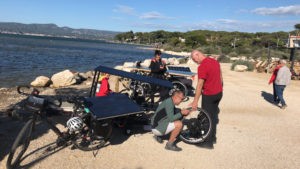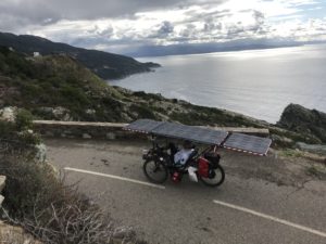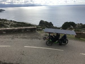 Laurence est parti sur le tricycle ICE VORTEX que j’avais utilisé sur le SUN TRIP FRANCE 2020 avec 340 Wc solaire en « toiture » et un Bafang réducté code 13 homologué 250W en roue arrière. Ce moteur s’est révélé trop faible sur les étapes de montagne corse pour les 40 kg du trike. Il faut impérativement partir sur ce Corsica avec un moteur puissant et/ou un moteur pédalier.