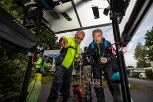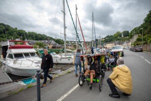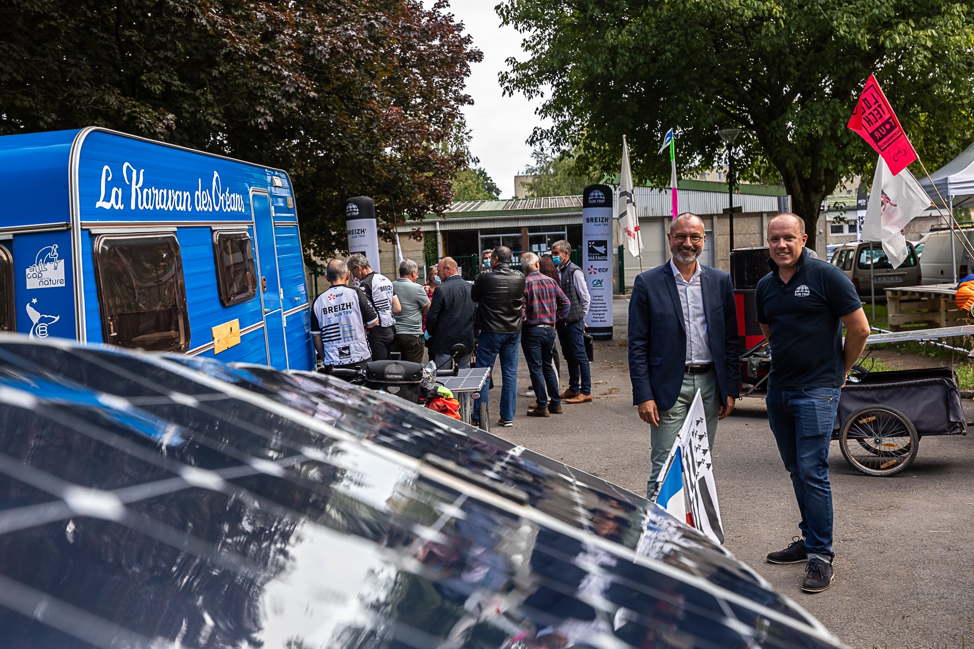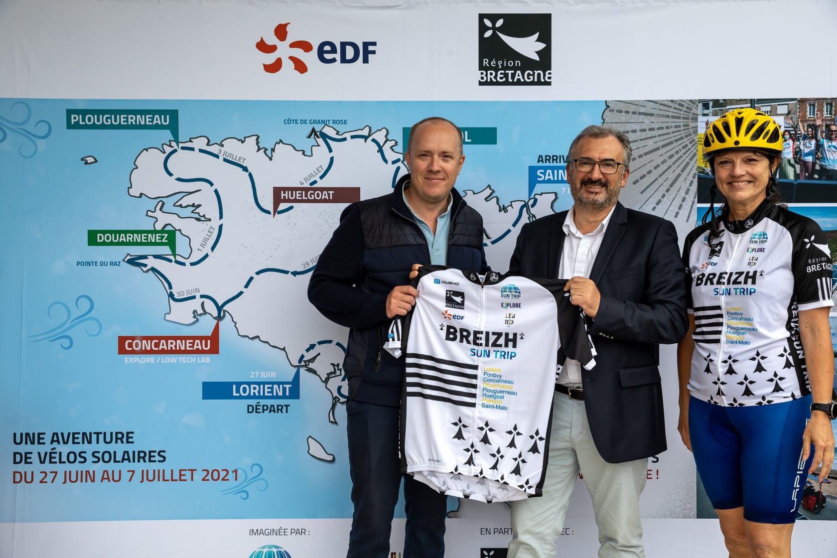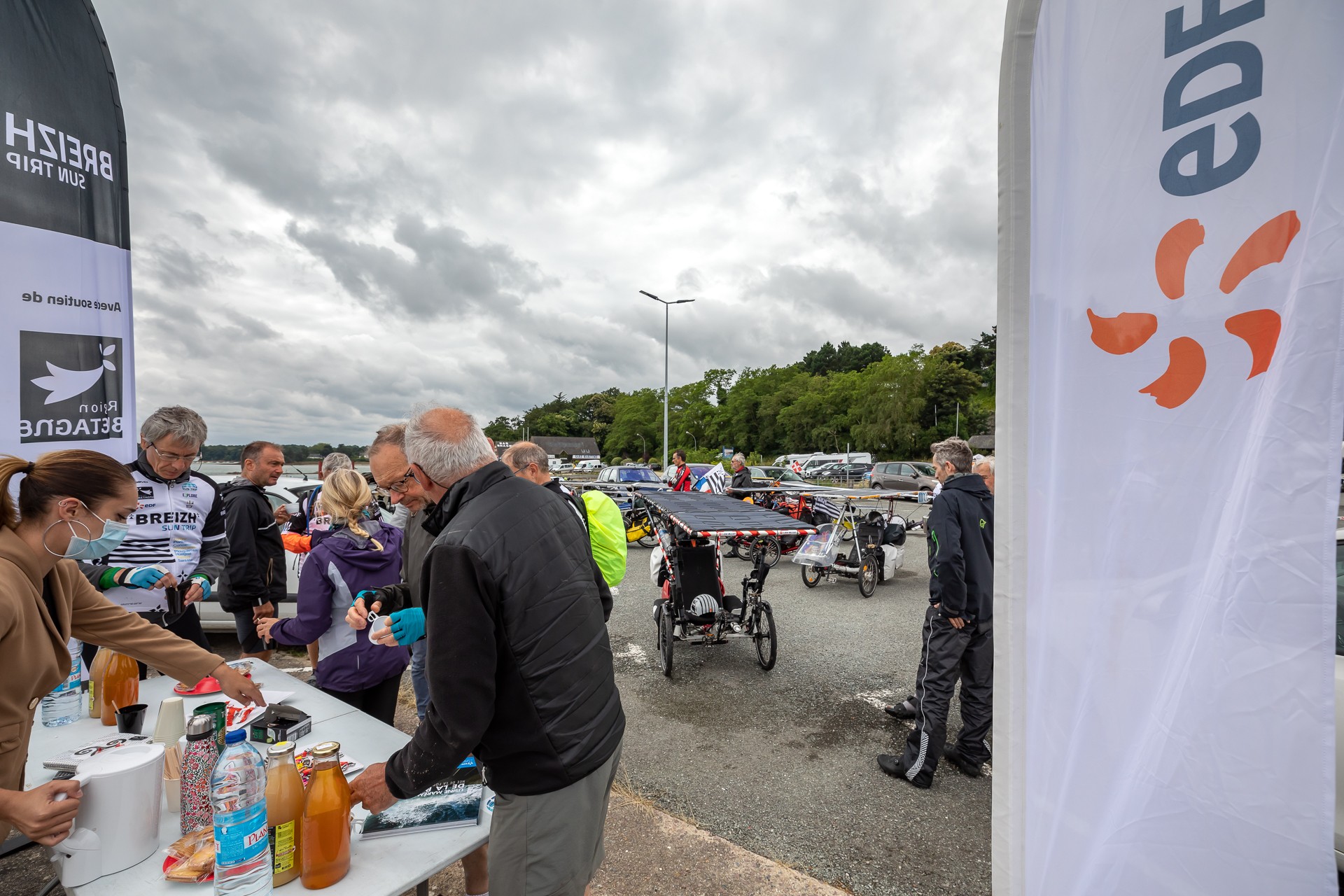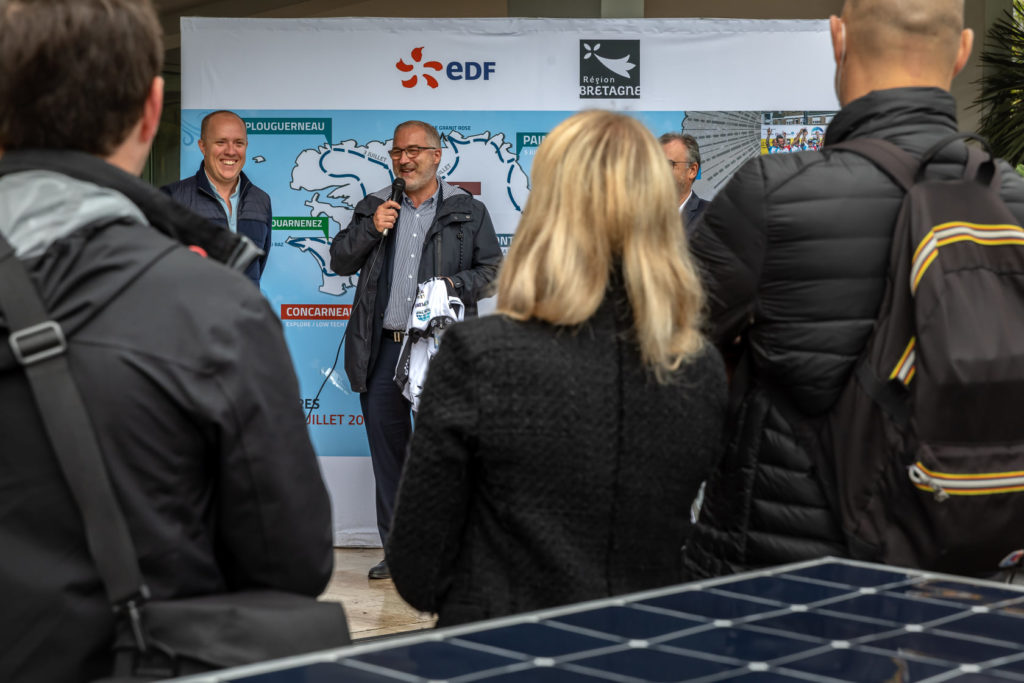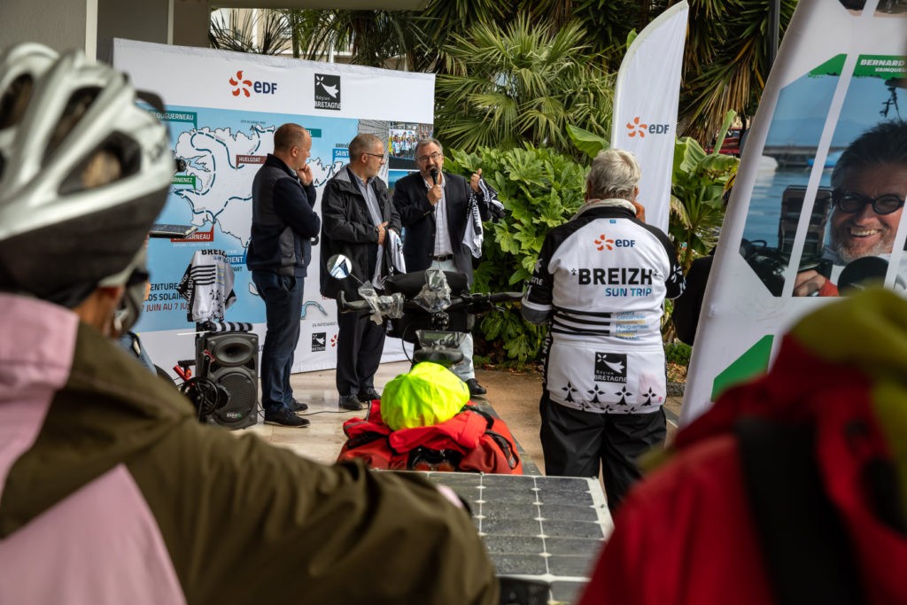 Dimanche 27 juin, départ en présence du maire de Lorient, Fabrice Loher , et du directeur régional d’EDF en Bretagne, Jean-Philippe Berton. Une belle éclaircie au moment du départ et c’est parti pour l’aventure bretonne !
