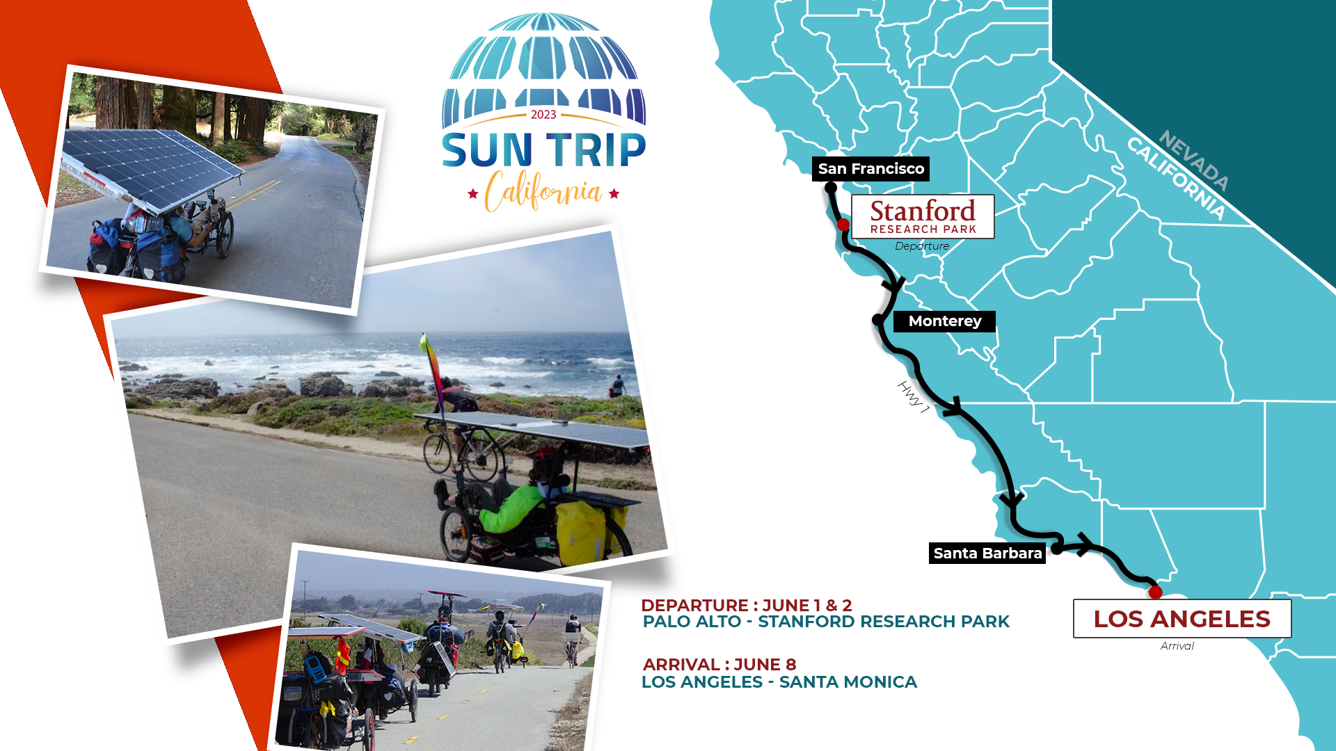 Après le succès de l’édition test, au printemps 2022, le Sun Trip California 2023 sera organisé sur un parcours imaginé entre Palo Alto (Stanford Research Park), San Francisco et Los Angeles, du 1er au 8 juin.