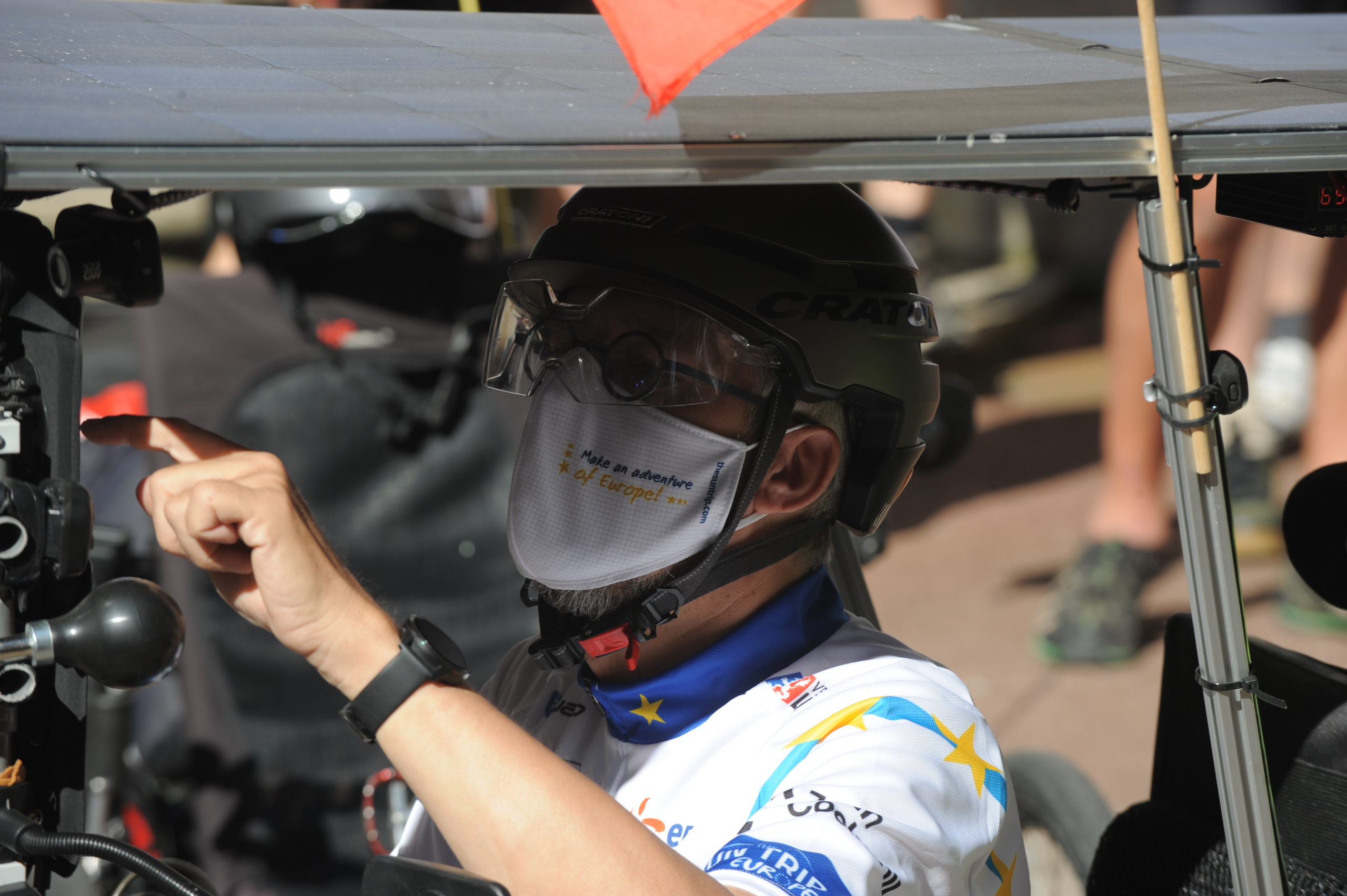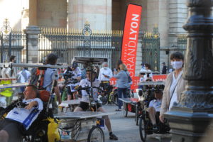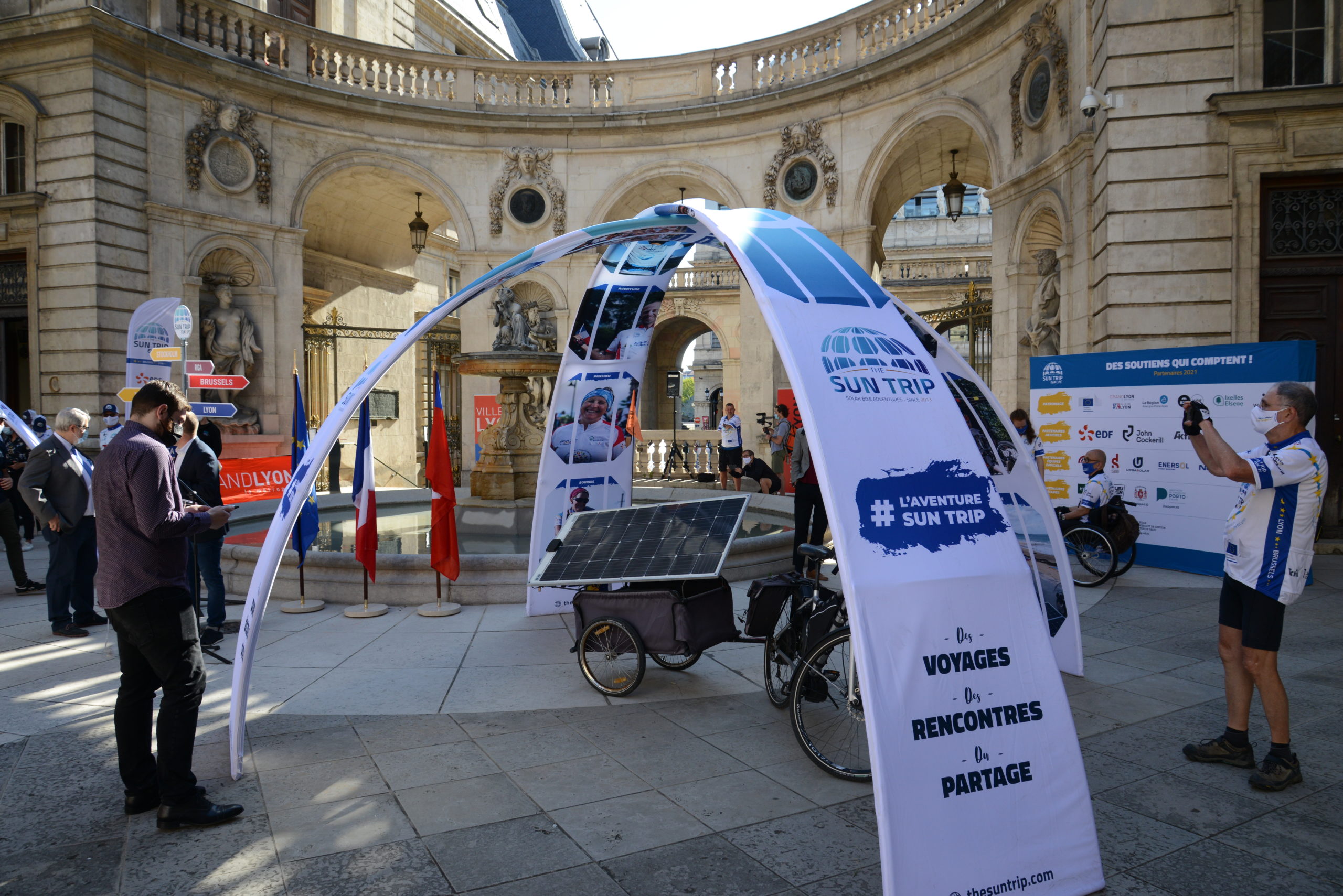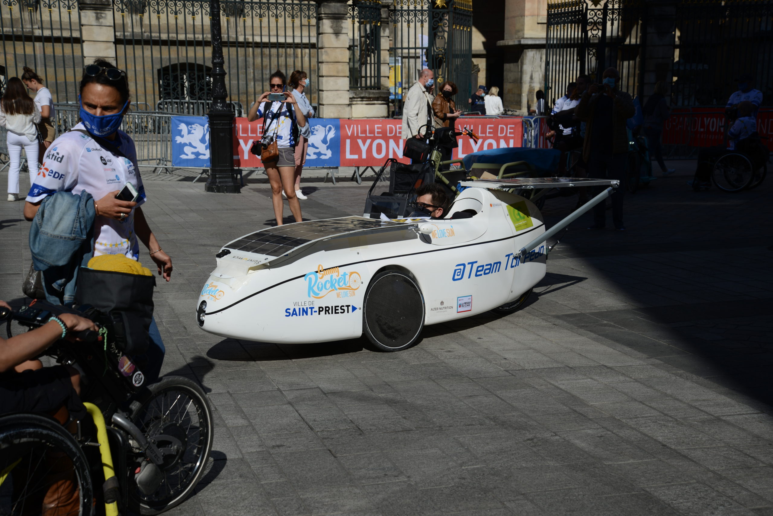 Dans les vélos solaires au départ à Lyon ce matin, coup de chapeau aux 2 vélos “Benur” solaires, des engins imaginés par la société lyonnaise du même nom, qui vont permettre à 5 personnes à mobilité réduite de rejoindre la capitale européenne propulsés à l’énergie solaire.