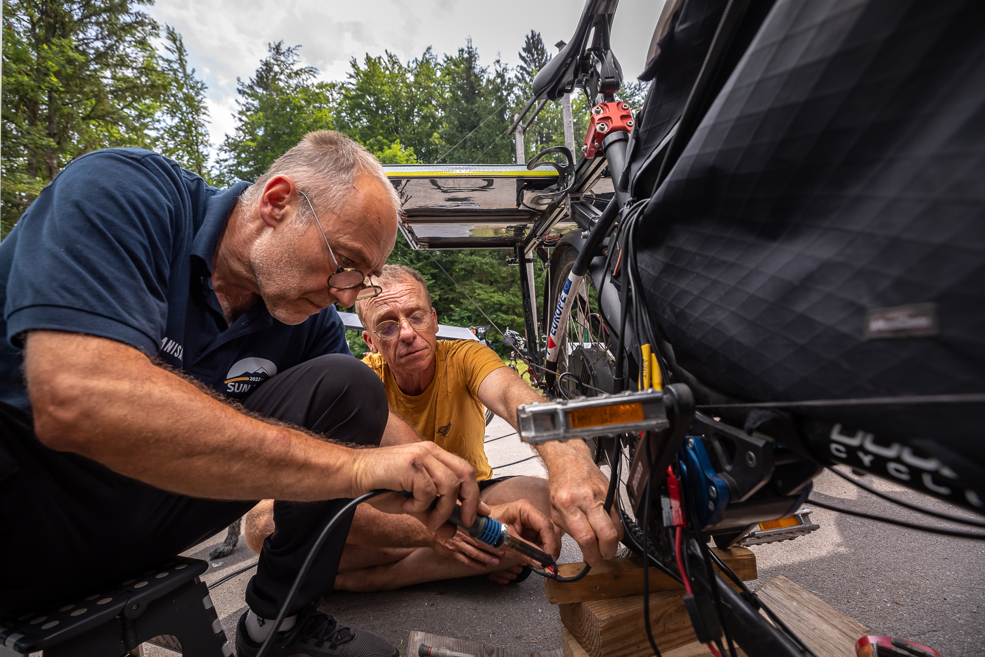 Les SunTripers profitent de leur mercredi de libre pour bricoler, se reposer, profiter du lac et réfléchir à leur prochain itinéraire jusqu’à Conegliano.
