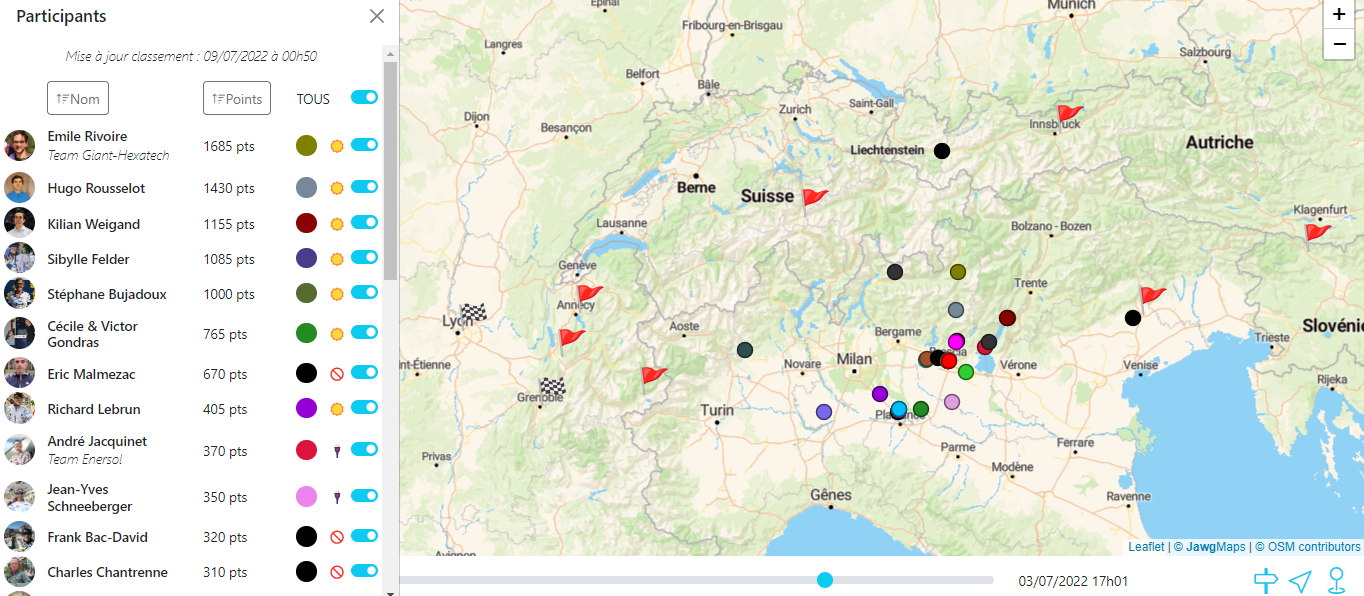 Outils indispensable pour le suivi de l’aventure, la carte en direct aura connu cette année son plus grand succès. Avec le retour du « challenge des cols par point », la carte permettait de calculer le classement en temps réel des points collectés par les participants en fonction de leur itinéraire.