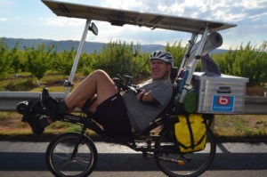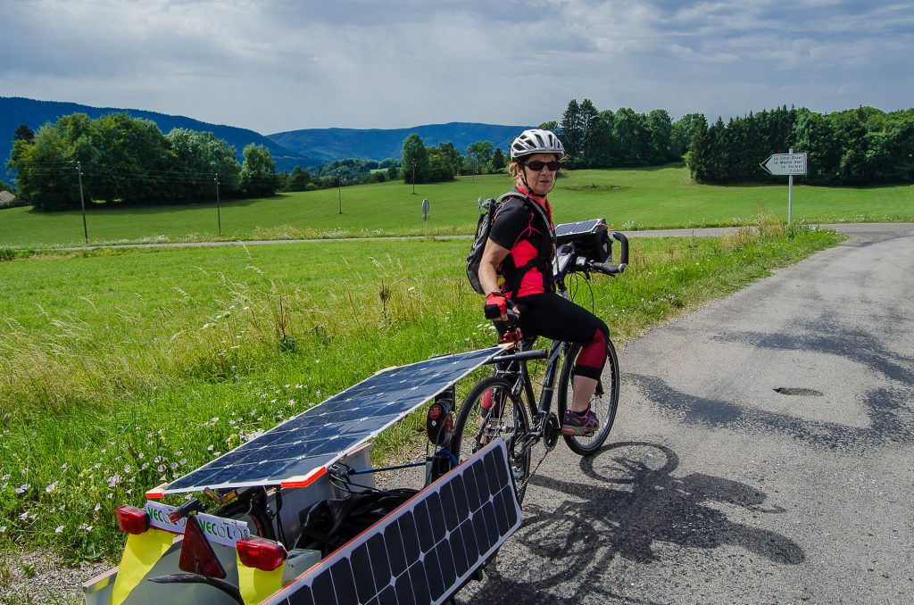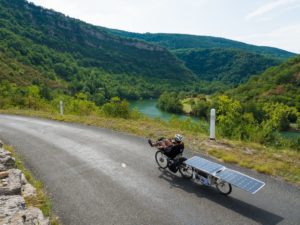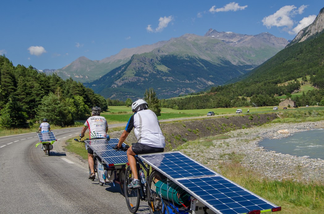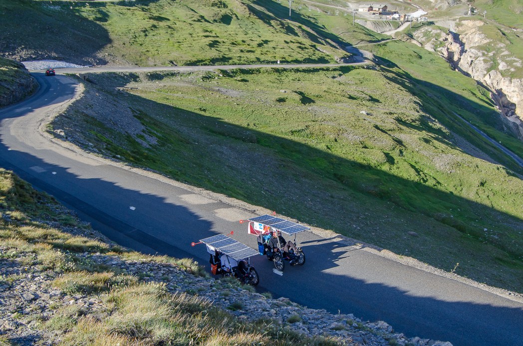 La montée du Vercors a été attaquée principalement par la vallée de la Bourne mais un groupe de cinq courageux avaient visé plus au sud via le col de Rousset, 20 km d’ascension en lacets au-dessus de Die ! Toujours en 100% solaire, Michel et Louis étaient bien à sec et se sont résignés à rouler 40 km sans assistance pour économiser l’énergie nécessaire à la montée. Le détour et la météo capricieuse, leur coûtera toutefois d’arriver au-delà du délai fixé pour le challenge du Super Suntripper. Malgrè 236 km au compteur, ils étaient donc pénalisés pour cette étape. L’équipe de Béatrice, Yannick et Isabelino n’évoluait elle déjà plus en 100% solaire, mais le plaisir de la grimpe a pris le dessus. Deux ans après leur participation à l’édition Sun Trip Milan-Antalya-Milan vers la Turquie, Béatrice et Yannick sont maintenant accompagnés par deux amis qui se relaient au guidon d’un troisième vélo toujours construit par Yannick “MacGyver” Aspe.