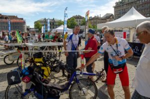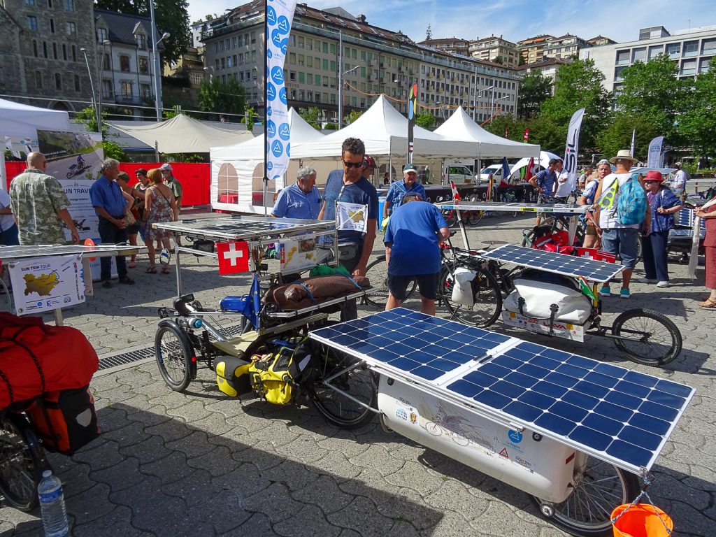 Sur la place de la Riponne, le peloton a été accueilli sur un événement organisé par les Services industriels de Lausanne en présence de Jean-Yves Pidoux, directeur des Services industriels de Lausanne, de Laurent Balsiger, directeur de l’énergie du Canton de Vaud et du Florian Bailly, directeur du Sun Trip. Notons aussi la présence sur la place du magasin Tandem Lausanne et de l’association SSES-RSO. Merci à tous d’avoir fait le succès de cet événement !