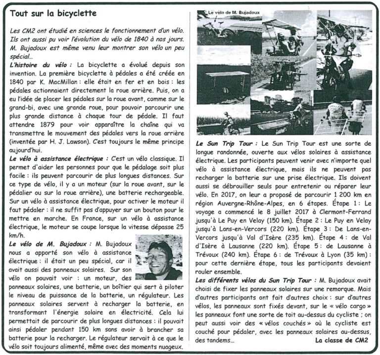 Dans le journal de l’école, les élèves ont rendu compte de leurs découvertes, l’histoire de la première bicyclette jusqu’au vélo électrique, l’aventure du Sun Trip et la diversité des vélos solaires…