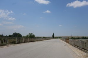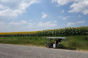 Devant un champs de tournesols en Bulgarie. Remarquez l’asphalte rempli de pierres couvertes de bitumes, qui font que le vélo vibre dans tous les sens. Ces routes m’ont coûté mes 2 gardes-boue avants ^^’