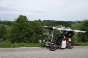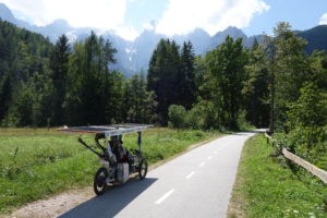 Mais grâce à une roue donnée par le tenancier de l’auberge où je me suis “réfugié”, j’ai pu réparer. Vous pouvez admirer ici le magnifique rendu de la jante rose sur le vélo qui attend que son moteur refroidisse (la Slovénie est magnifique, mais qu’est-ce que ça grimpe!)