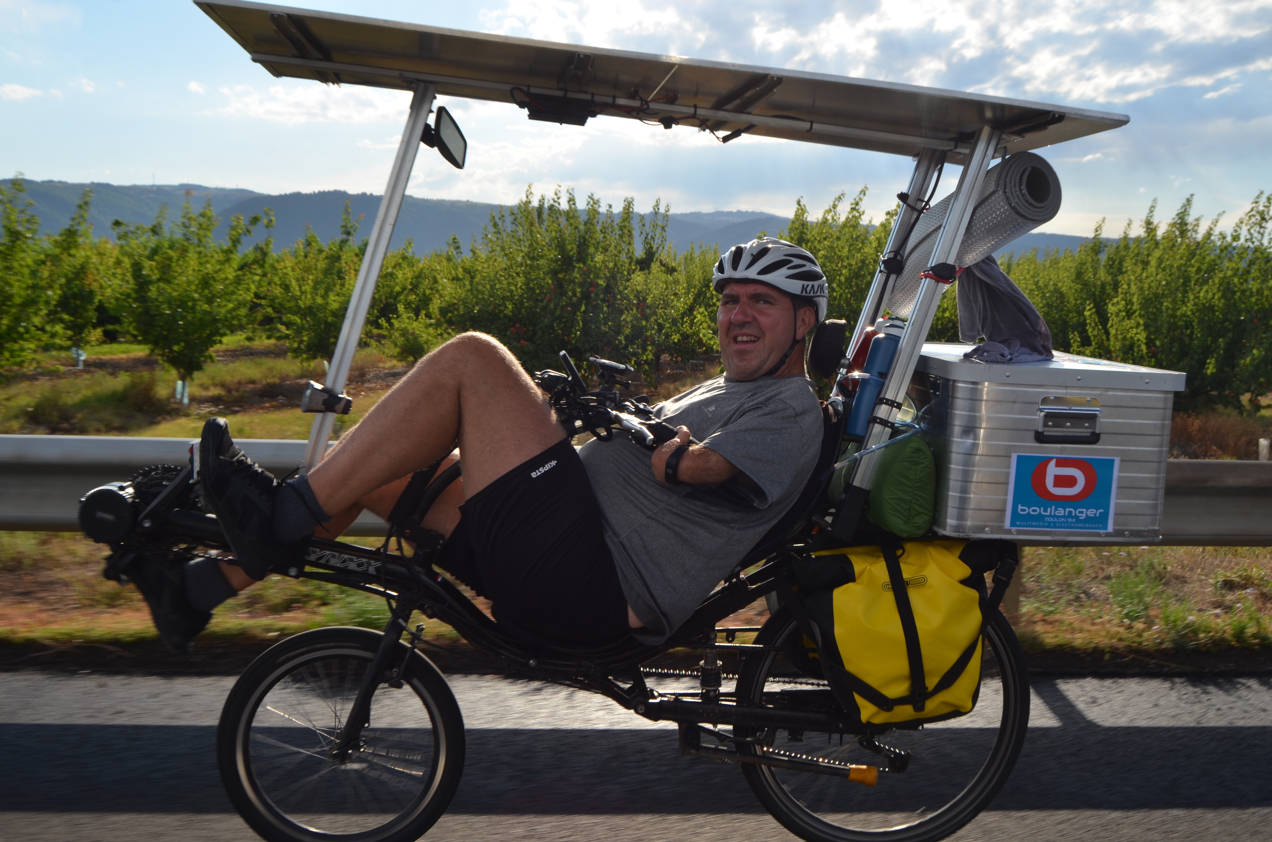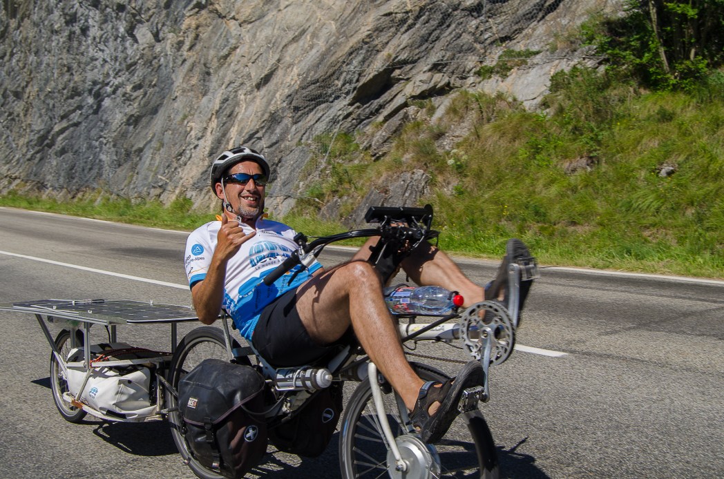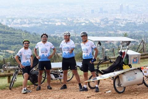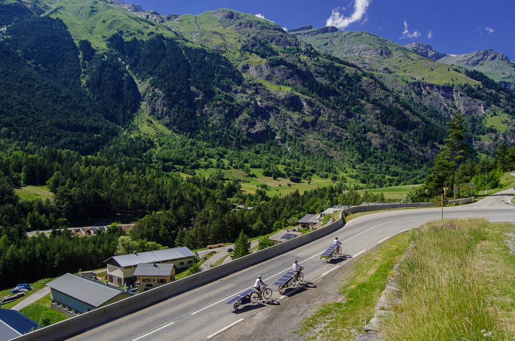The Massif du Vercors was mainly climbed through th Bourne River Valley, but a group of five courageous cyclists aimed further South on the Col de Rousset, climbing 20 km in gorgeous laces ove the town of Die ! Still riding 100% with solar energy, Michel and Louis’ batteries were almost empty and decided to ride 40 km without assistance in order to spare enough energy to climb. But this detour and the tricky weather made them arrive in Lans past the cut-off time for the Super Suntripper Challenge. Despite riding 236 km, they were penalized on this stage. Béatrice, Yannick et Isabelino were no longer 100 % in solar energy, but they went that way for the pleasure of riding. Two years after taking part in the Milan-Antalya-Milan Edition in Turkey, Béatrice and Yannick are now cycling with two friends sharing a third bike designed by Yannick “MacGyver” Aspe.