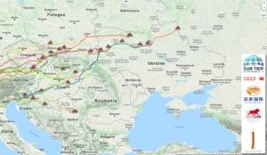 Both routes merge in Western Ukraine, near Lviv. Belgian Raf Van Hulle leads the pack. Champion in 2013 and second best in 2015, he always manages to avoid the rain falling on the Alps. Utterly aware of the weather forecasts, he adjusts his navigation precisely. After 7 days, he crosses into Ukraine with a 300 km buffer with Stéphane Bertrand, the second in line and only southern route rider maintaining a spot in the lead group.