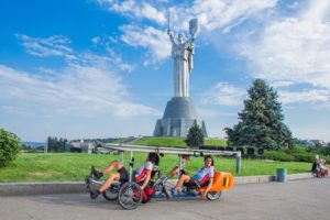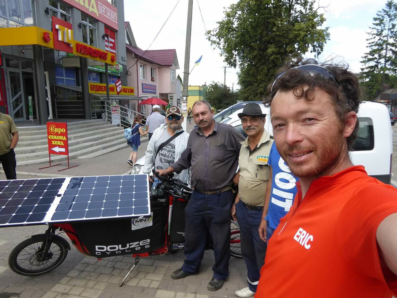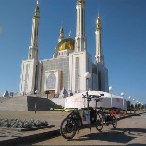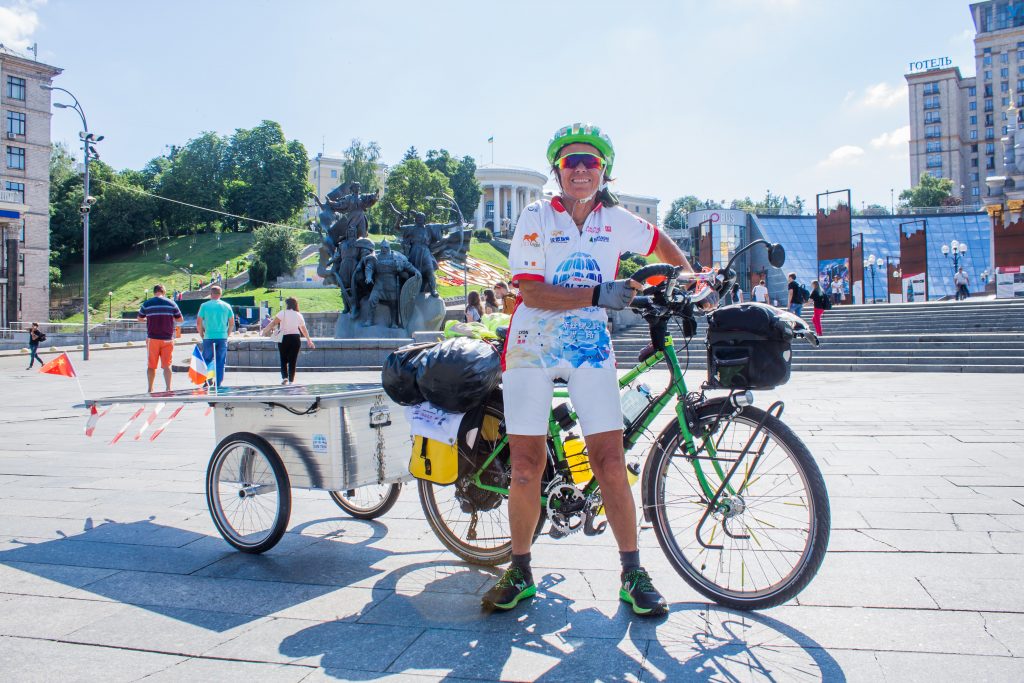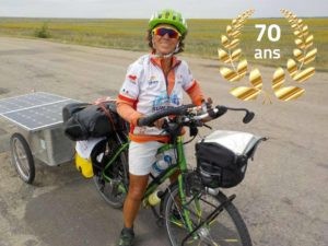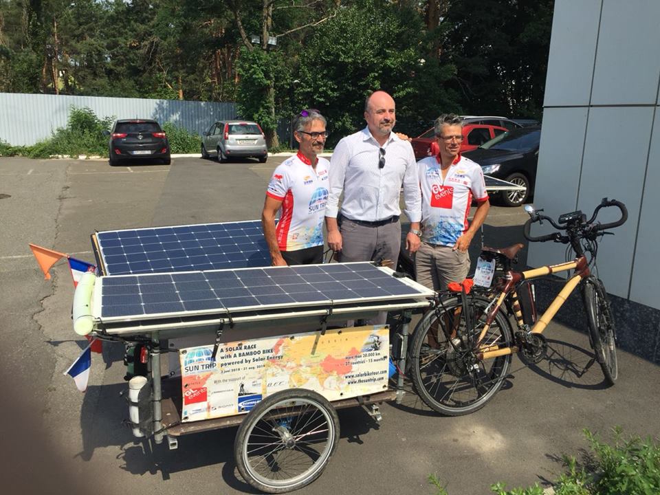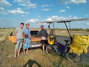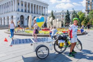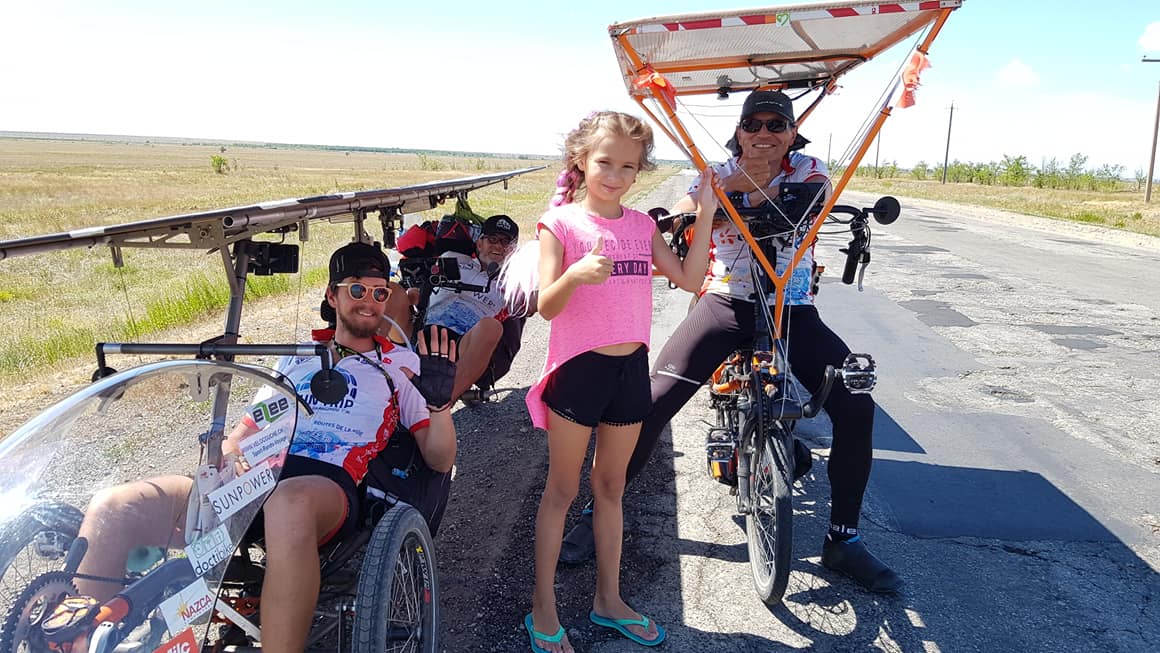 Soon turning 70, Françoise Denel is making steady progress at the rear of the group despite being unlucky. Our dean faces the rain, but stays the course. From the very first days on, she impresses. Downtown Kiev, she models for an improvised photo session. Her participation is a great example of the human possibilities offered by solar e-bicycle. As an experienced touring cyclist, she crossed South America but is now finding a way to keep the wheels turning. The solar grandma is a real life and social media star! The electric and solar assistance opens the doors of the legendary silk roads and allows her to be part of this collective adventure where everyone carries a strong message for ecology.