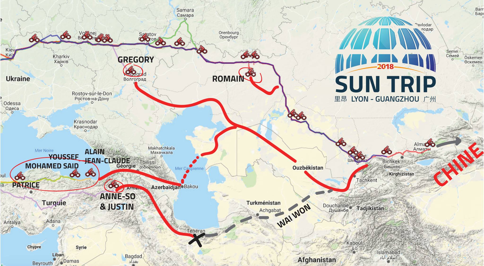 Comme Patrice ils étaient 6 équipages à choisir l’itinéraire Sud, passant par la Turquie, la Géorgie, l’Azerbaïdjan. Deux équipages passaient même par l’Iran, Wai Won Ching (disqualifié dès le début pour non respect des règles élémentaires de l’aventure) et le duo franco-canadien Anne-Sophie Rodet et Justin Lemire-Elmore, qui avaient eux actés d’un abandon à Téhéran (pour cause de mariage en août !). Leurs itinéraires (plus long et montagneux que les routes du Nord) ont offert au Sun Trip 2018 autant de nouvelles façon de voir l’aventure sur la route du grand Est. En Turquie l’équipage marocain Youssef El Haouass & Mohamed Said Jbari avait le plaisir de d’être accueillis et aidés par Murat Suyabatmaz, illustre fan du Sun Trip, ayant contribué au succès de l’édition 2015 mais aussi au bon déroulement de deux rapatriements sanitaires (en 2013 et 2015).