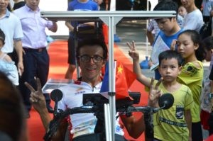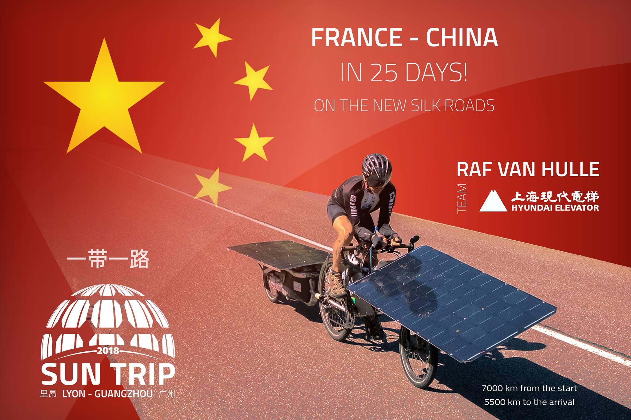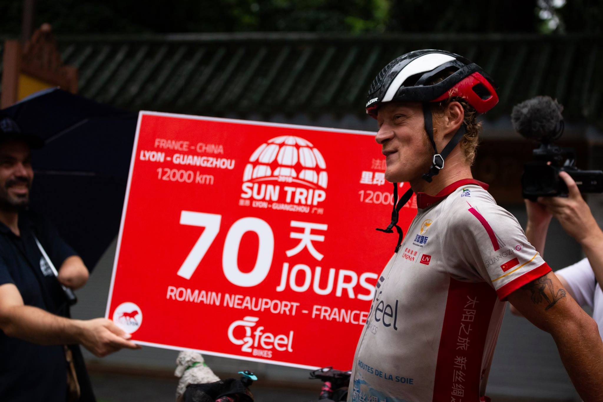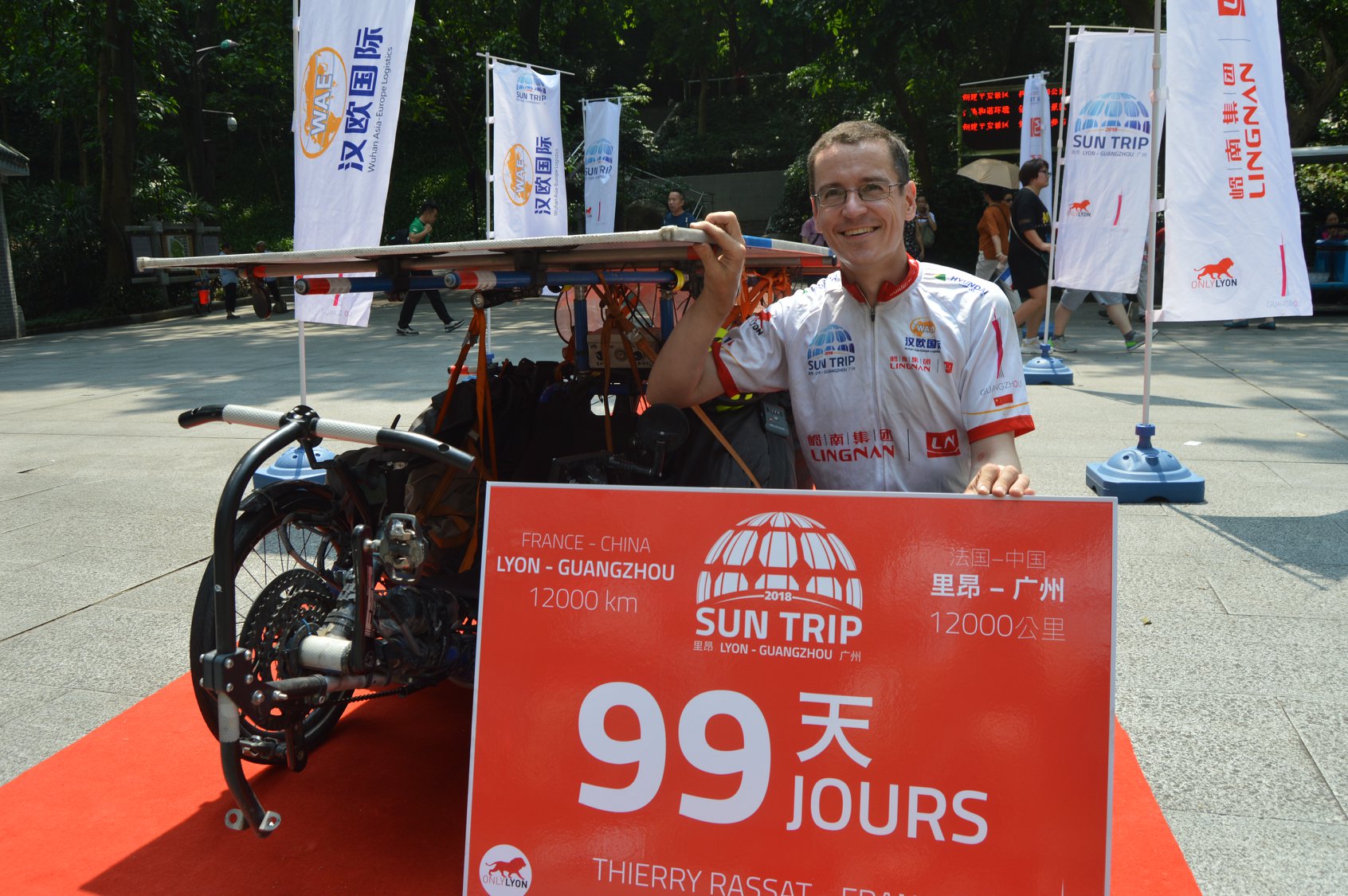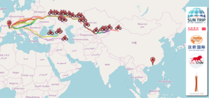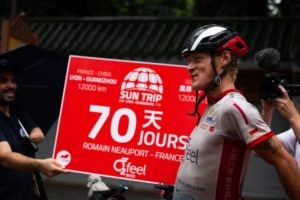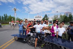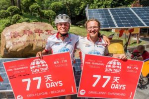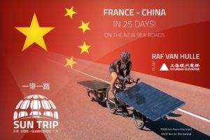 Raf Van Hulle rejoint l’arrivée le 3 août 2020, moins de 45 jours après le départ réel de France ! Il possède environ 1500 km d’avance sur le second. En présence d’une quarantaine de médias, des consuls généraux de France et de Belgique et des partenaires chinois du Sun Trip, l’exploit de Raf est célébré. Il devient l’homme sans pétrole le plus rapide de l’histoire des routes de la soie, capable d’avancer à coup de 280 km par jour entre la France et la Chine ! Le solaire ça marche fort et le Sun Trip s’affirme comme vitrine planétaire de cette énergie d’avenir.