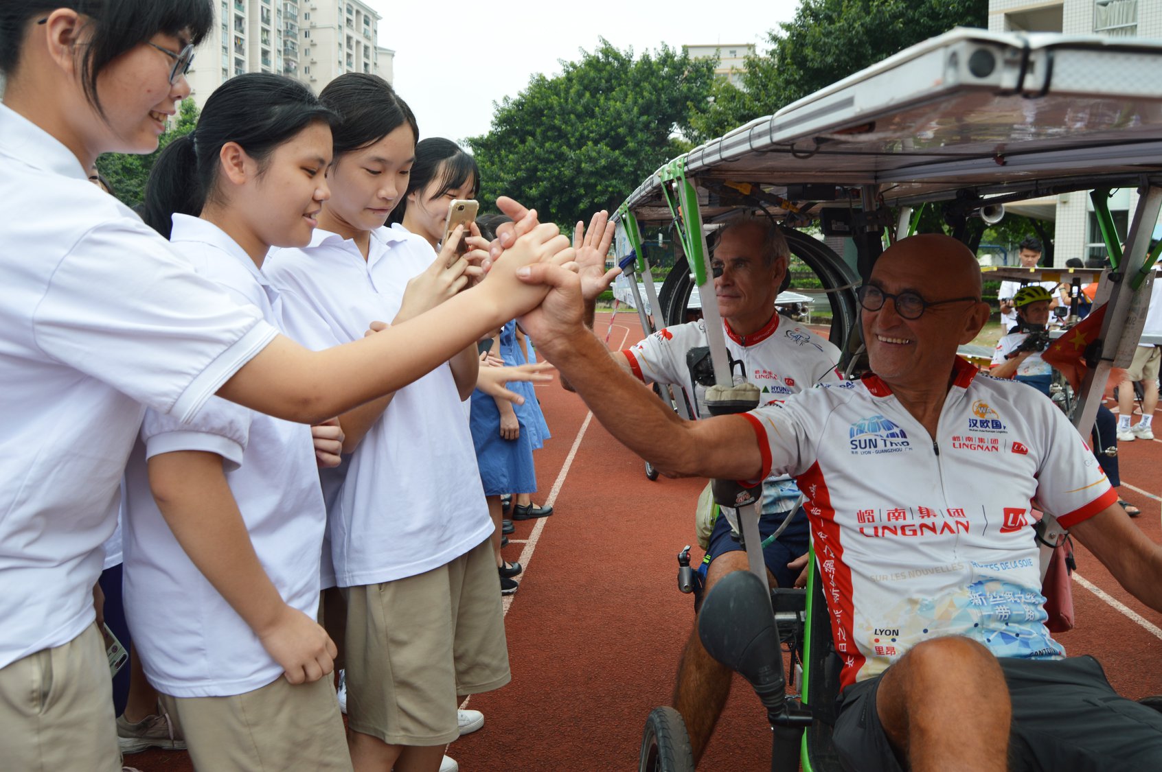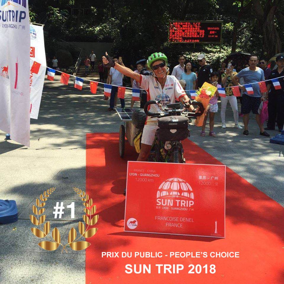 Françoise Denel, la doyenne solitaire, arrivait en 103 jours à Canton, fatiguée mais toujours vaillante elle aura éclairé par son courage cette édition 2018 du Sun Trip. Qui ne rêverait pas de pouvoir dire que sa mamie est allée à Canton en vélo solaire ?