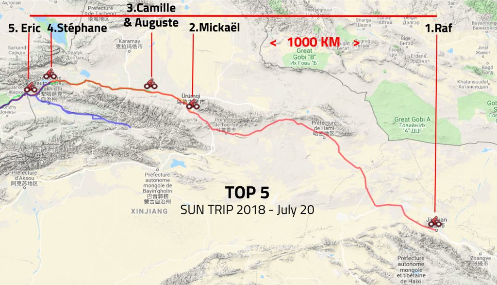 En tête de peloton Raf Van Hulle arrive en Chine en 25 jours seulement ! Sa moyenne journalière est remontée à 300 km ! L’exploit est déjà phénoménal et sa performance n’allait pas faiblir sur les 5000 km restants. Son avance à l’entrée de la Chine n’était toutefois pas décisive, tout restait ouvert, notamment avec son poursuiteur direct Stéphane Bertrand ou encore avec Michael Joguet, auteur d’une remontée progressive et sans bavure.