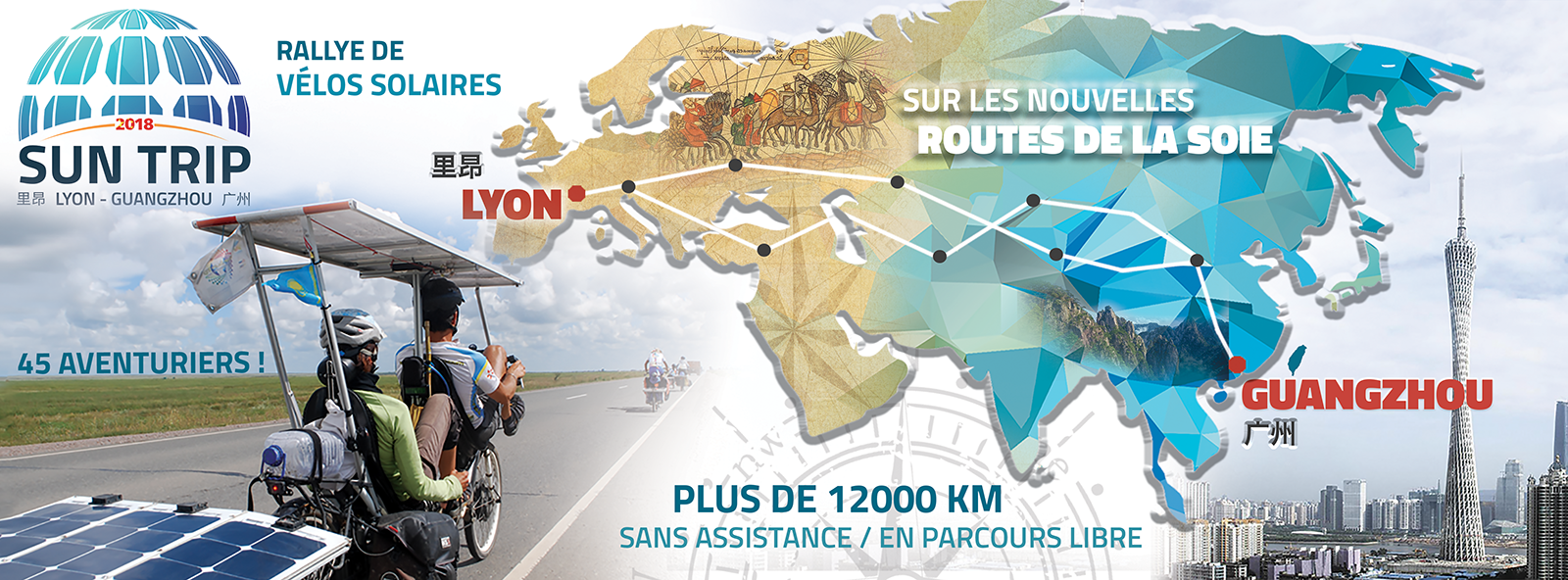 Three years after the last continental event, a third version of the great Sun Trip rally took place in the summer of 2018 between Lyon, France and Guangzhou (Canton), China. Riding across 10 countries and over 12,000 km, 36 adventurers rode on the New Silk Roads to celebrate the 30th anniversary Lyon-Guangzhou city twinning.