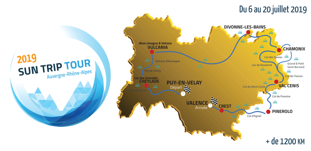 The Sun Trip Tour 2017 Auvergne-Rhône-Alpes started in the Massif Central mountains. Regional in scope, its route is no less daring, bringing together 45 participants on a 1000 km journey from Clermont-Ferrand to Lyon, crossing a dozen alpine passes and making an incursion in Switzerland and Italy.