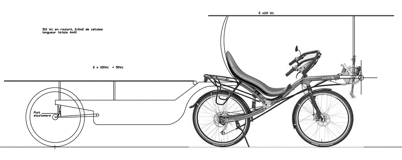 - – Nazca Pioneer for Switss Eliott Guenat. Directly inspired by Mickaël and Stéphane’s bikes. Grin Hub engine, Li-MN 48 v 21 ah battery, 150 WC solar roof installed by Declic-eco and 220 w with the Touzet trailer soon.