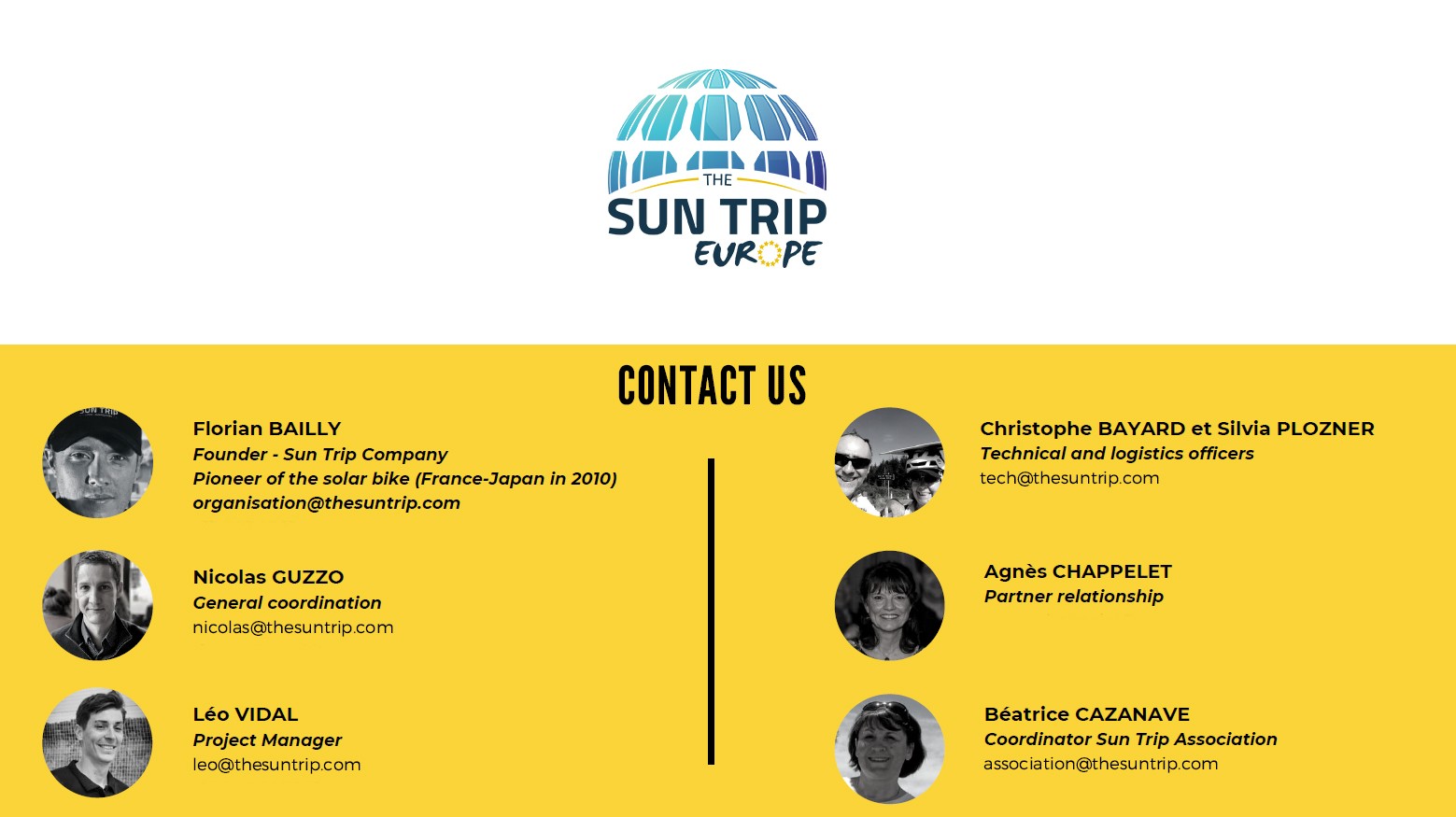 The second Sun Trip Tour is the joint work of a professional and volunteer team. This year certainly was the best when it comes to team logistics. In charge: Angélique Galvaing as coordinator, the Zeppelin Agency for photo and video production, Dirk Huyghe and Michel Bamps for logistics, the Vecolo Association for the mobile workshop, Olivier Reginensi and Paul Baudry for the technical support.