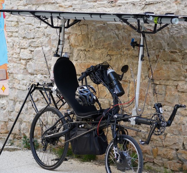I have all the parts ready to be assembled to create a bike with a well-tested design style for the Sun Trip: a recumbent bike with a solar roof and a solar trailer. Bikes like this have covered thousands of kilometers on many editions of the Sun Trip and seem to be a solid formula for success.