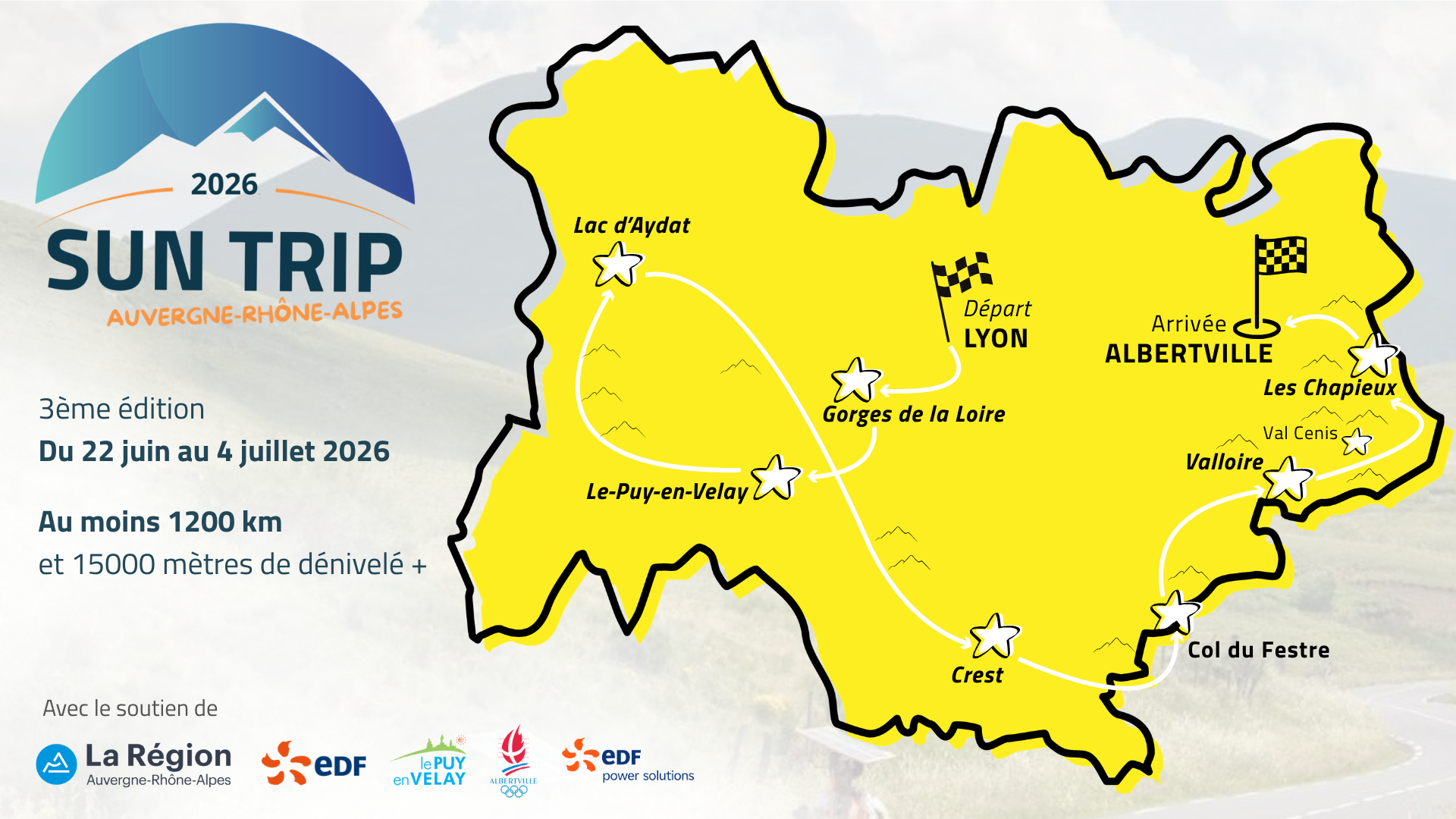 Route : We are currently working on a route that would start in Lyon (headquarters of the Auvergne-Rhône-Alpes region), on June 22th, head towards the Monts d’Auvergne, and then on to the Alps. The finish line would be in Savoie, in Albertville, with a few major mountain passes along the way and perhaps an overnight stay in a mountain refuge. Here a first view of the map :