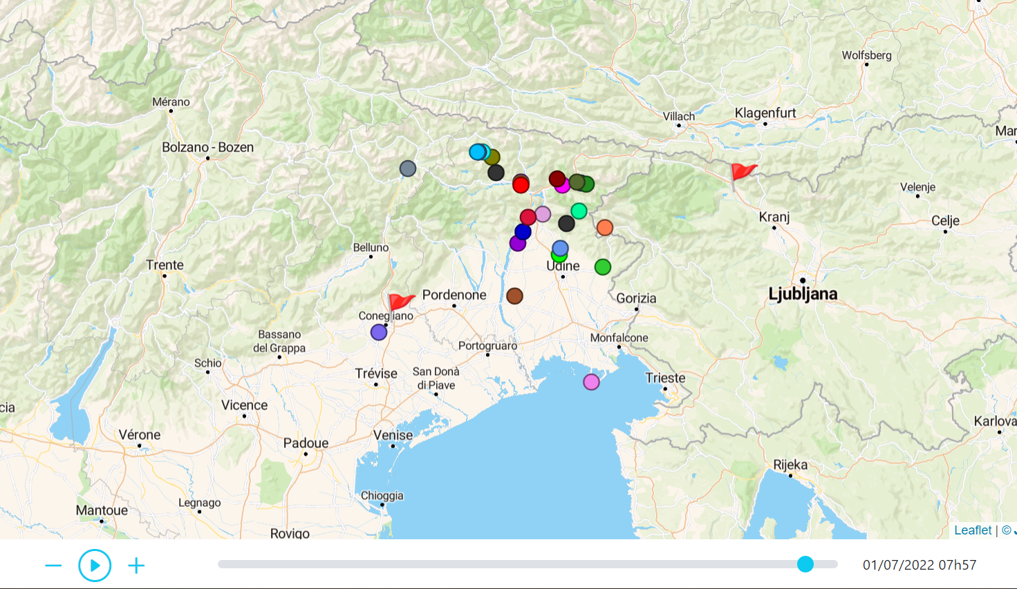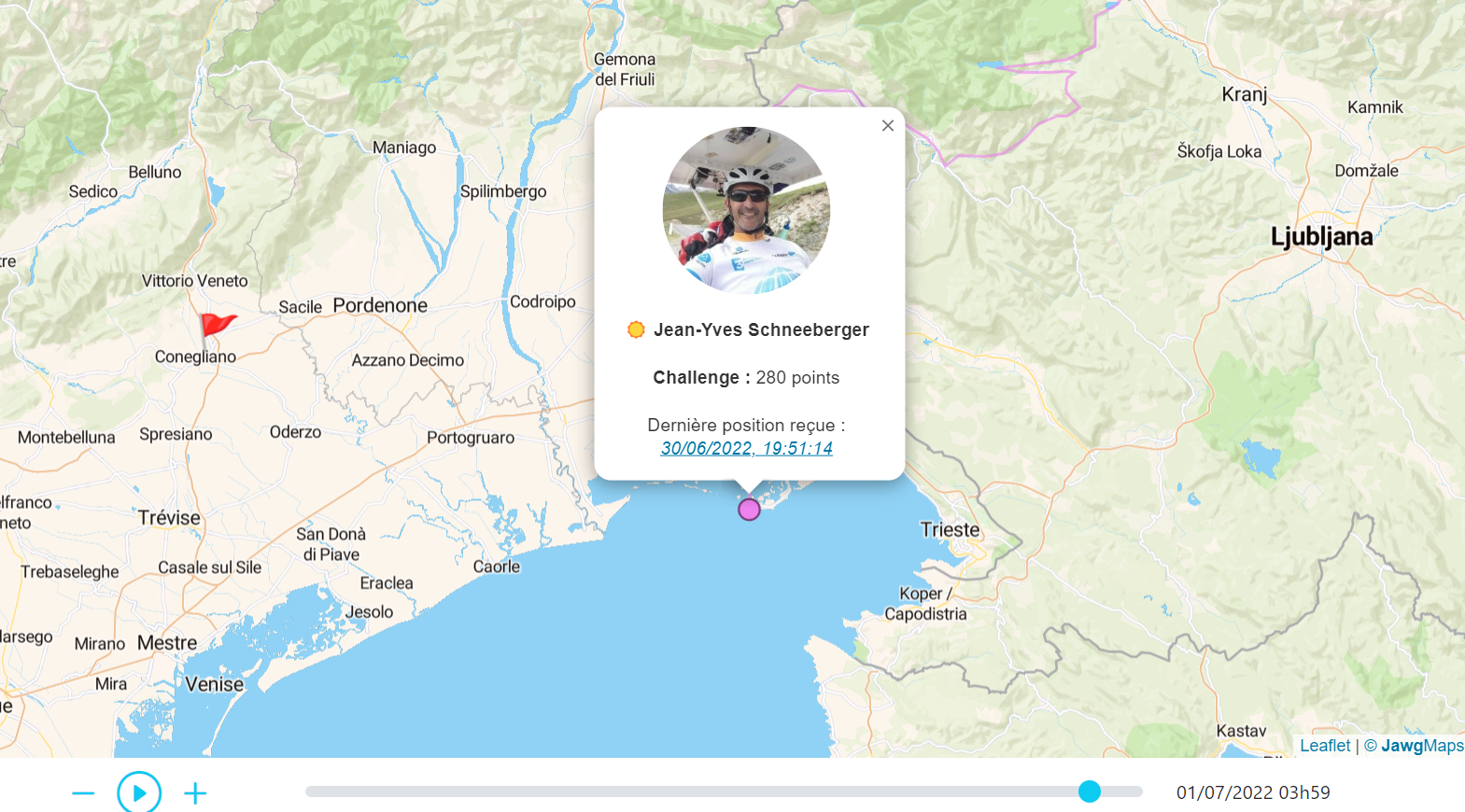 Au matin du 1er juillet, sur une étape Bled-Conegliano relativement courte, il était intéressant de noter que le groupe était très éclaté, avec un coup de chapeau au Suisse Jean-Yves Schneeberger qui a décidé de faire le détour pour voir la mer Adriatique !