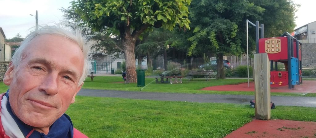 » Hier soir, après de nombreuses recherches, je n’ai pas trouvé d’endroit où dormir dans les hôtels ou les campings, alors j’ai trouvé ma place à la manière d’un vagabond, dans un terrain de jeu avec une pelouse d’un vert suspect. À 2 h 30 ce matin, j’ai réussi à contourner les arroseurs en mettant ma sacoche par-dessus. »