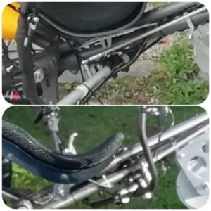 Réveillé en pleine nuit avec l’explication à mon problème d’instabilité de direction. Comme souvent, le mieux est l’ennemi du bien… Surtout quand on oublie les principes élémentaires de la mécanique. Sur la photo du bas, la direction du proto qui fonctionnait parfaitement, avec lequel je franchissais les escaliers, sur celle du haut la direction modifiée rendant l’engin trop incertain à piloter. L’illustration du passage d’une position d’équilibre stable avec l’axe du pivot de direction en avant de la potence à une position d’équilibre instable avec l’axe du pivot en arrière de la potence. Heureusement j’ai gardé toutes les pièces, faut simplement que je les retrouve dans mon garage 😉. L’optimisme est de retour avec un bon espoir de rejoindre la troupe du Suntrip du côté de Plougarneau.