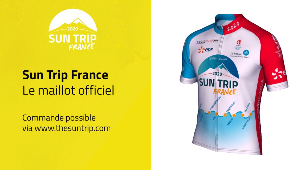 Le maillot du Sun Trip France affiche les villes-étapes du projet ainsi que les logos des partenaires officiels. Le maillot sera porté par tous les participants, inscrit pour tout ou partie du tour, ainsi que par les inscrits du prologue Strasbourg-Lyon. Les participants roulant pour le compte d’un partenaire de l’organisation auront un maillot personnalisé sur les manches.
