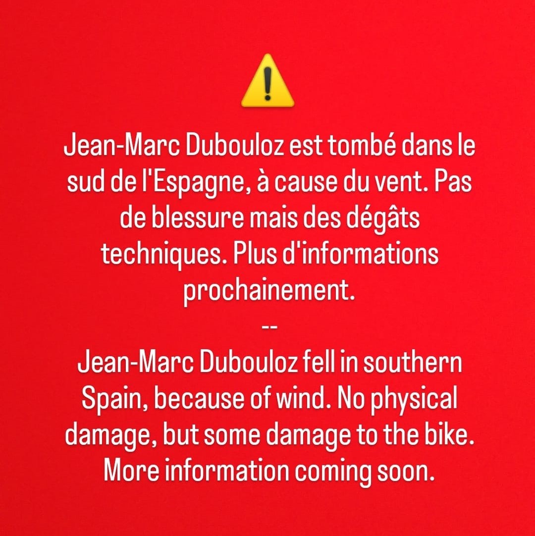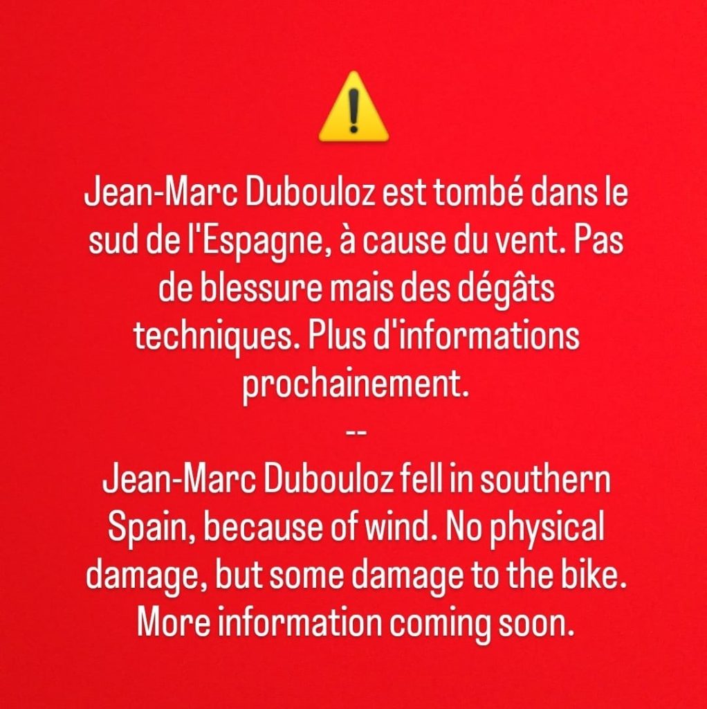 Le français a appelé l’organisation vers 12h30 ce vendredi pour informer d’une chute intervenue dans le sud de l’Espagne, peu après la localité de Xérès. Le vent violent qui souffle de l’Ouest serait à l’origine de la chute. Pas de blessures mais des dégâts techniques. Pour le moment Jean-Marc Dubouloz reste dans la course. Plus d’information prochainement.