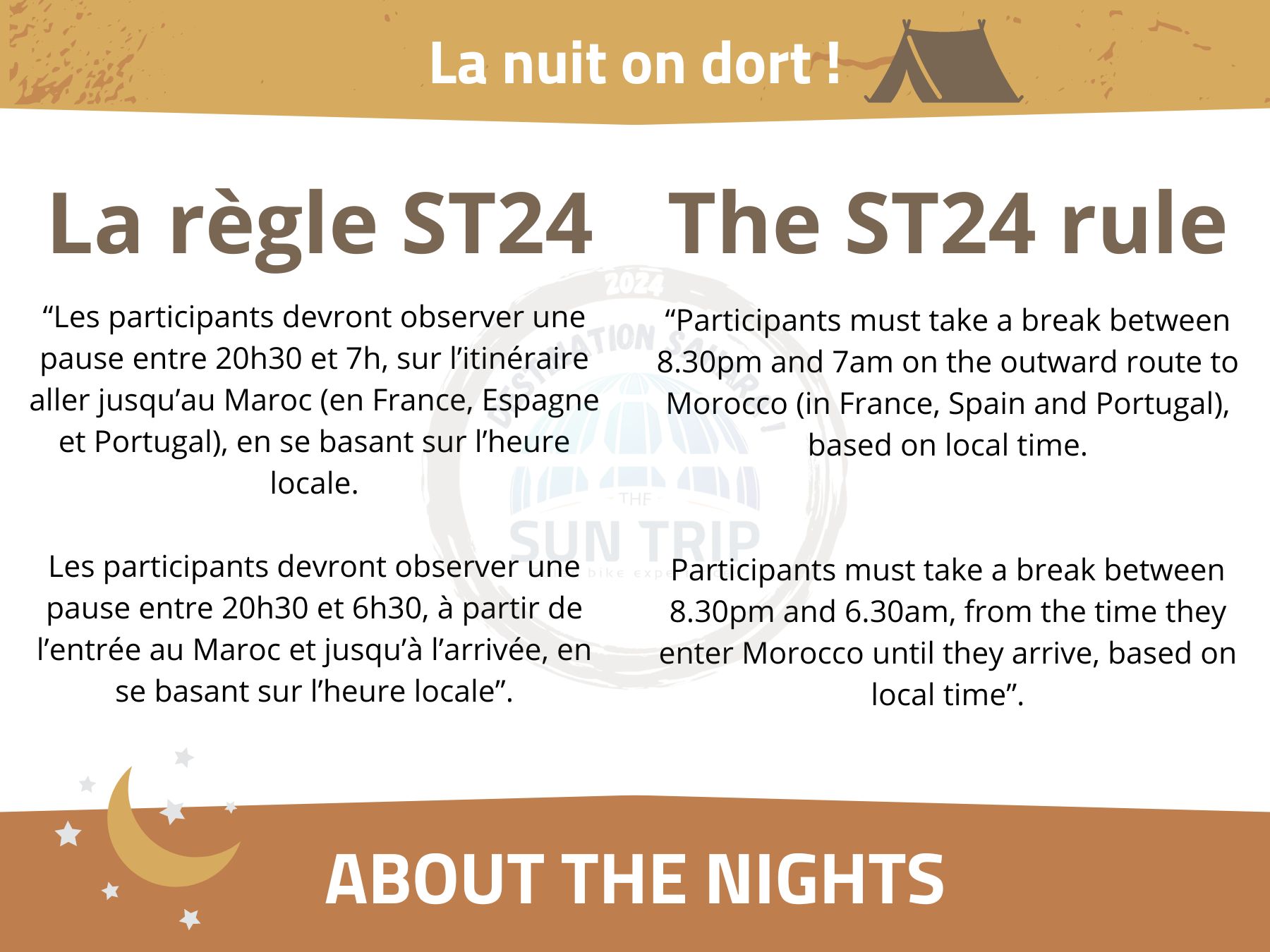Au regard d’un départ prévu tôt dans le printemps et quelques changements de fuseaux horaires à prévoir sur le parcours 2024, voilà les règles concernant la pause nocturne obligatoire. Cette pause fait partie de l’ADN du projet, car à la différence d’autres aventures à vélo nous estimons que la sécurité de nos participants doit primer. La nuit on dort !