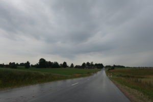 Après une soirée bien arrosée au camping chez un voisin d’emplacement qui avait invité  tous les gens à côté de chez lui à déguster la soupe locale (et autres joyeusetés), c’est le ciel lituanien qui pleure mon départ 🙂