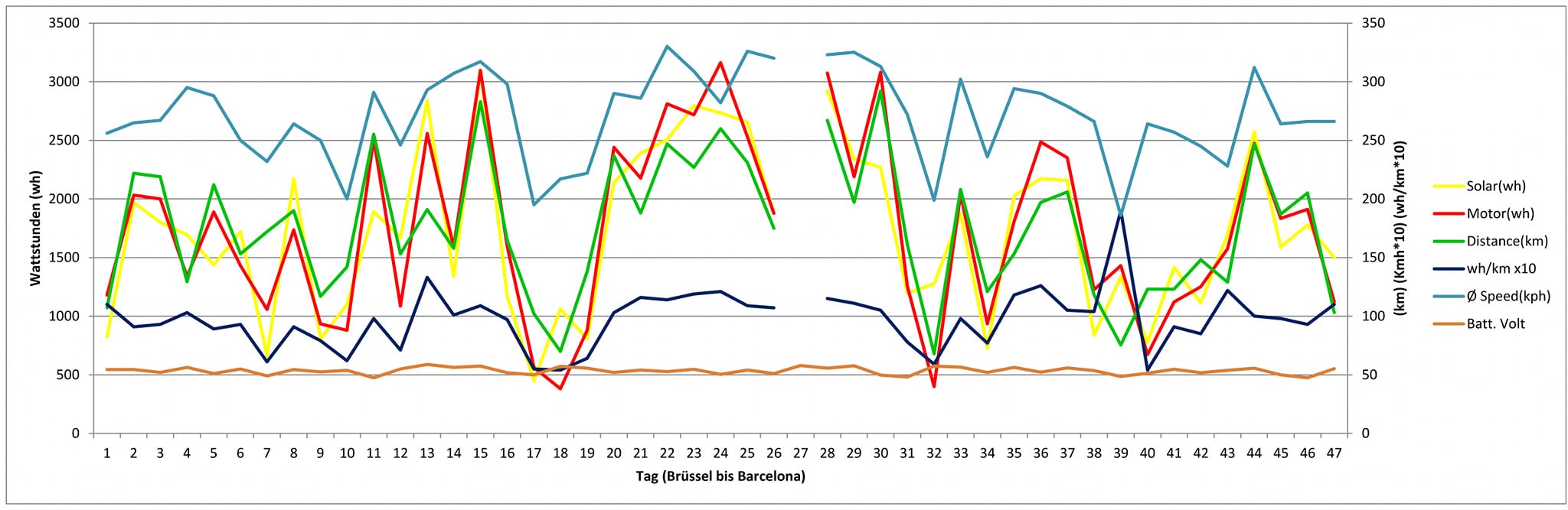 J’aimerais donc revenir sur nos chiffres. Je ne regarde que la période allant du départ à Bruxelles à l’arrivée à Barcelone, où nous étions en » mode course « , pour ainsi dire, et concentrés sur une production solaire maximale. Les chiffres les plus importants sont :