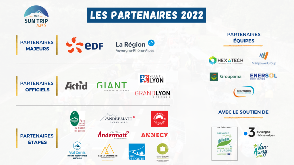 Le Sun Trip Alpes sera un nouveau grand et beau chapitre de notre dynamique, avec une traversée de 6 pays (dont 5 pays membres de l’Union européenne). Une boucle d’environ 2500 km, avec 7 grandes étapes et des accueils tous les 2 à 4 jours qui sera une occasion unique d’aller découvrir la richesse et la diversité des Alpes.