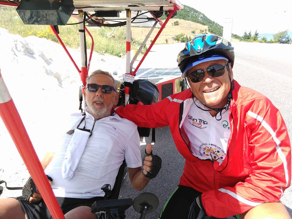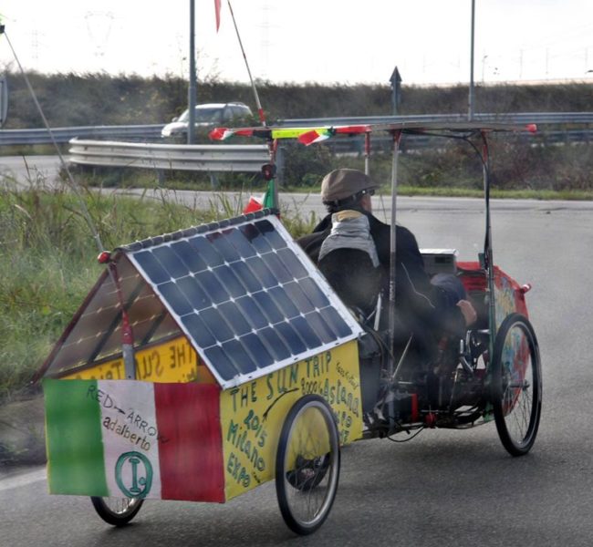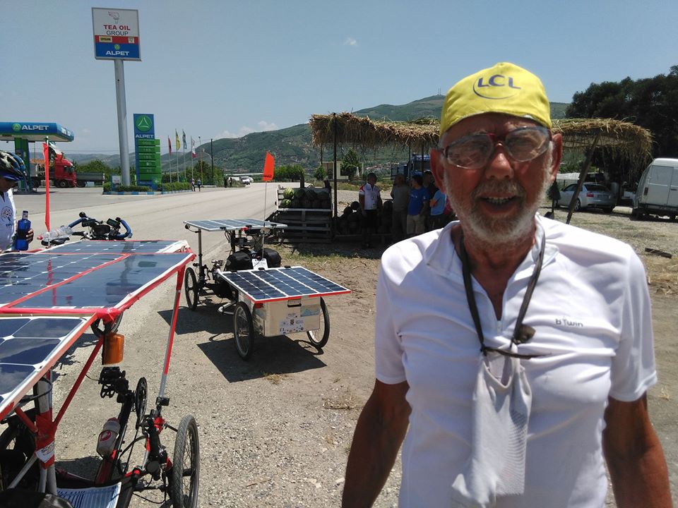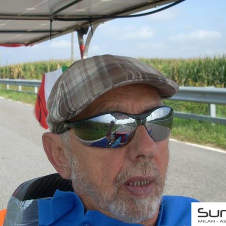 Vivant entre Turin et Milan, Abalberto est à la fois le doyen de l’édition 2015 mais aussi l’aventurier le plus âgé de l’histoire du Sun Trip ! Lui qui a déjà traversé les Alpes à cheval, a su profiter de sa retraite pour inventere de nombreux prototypes de vélos carénés solaires.