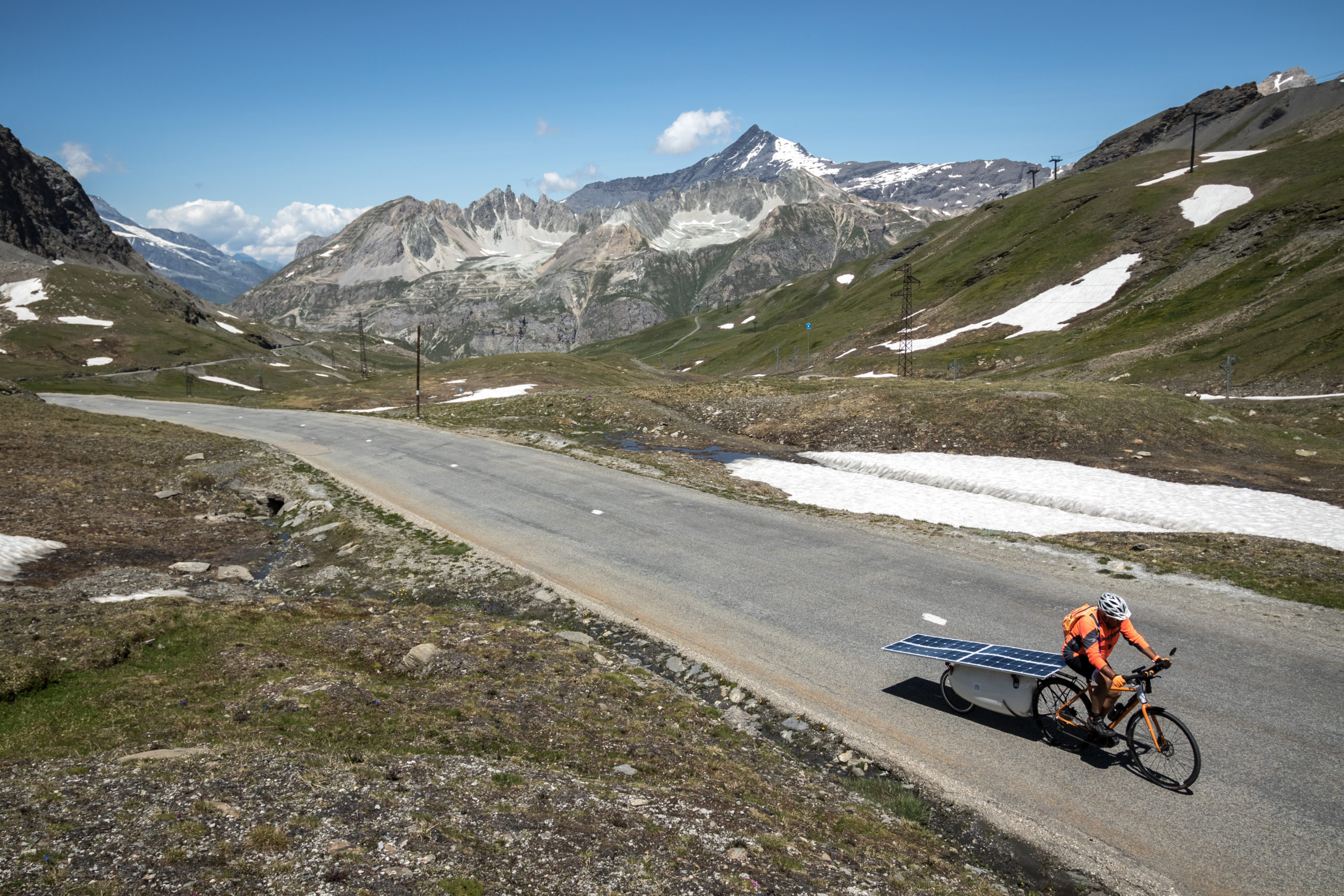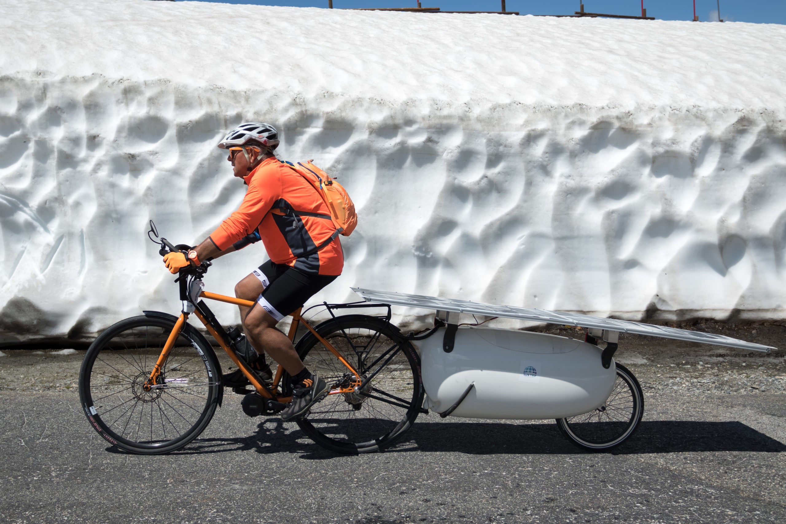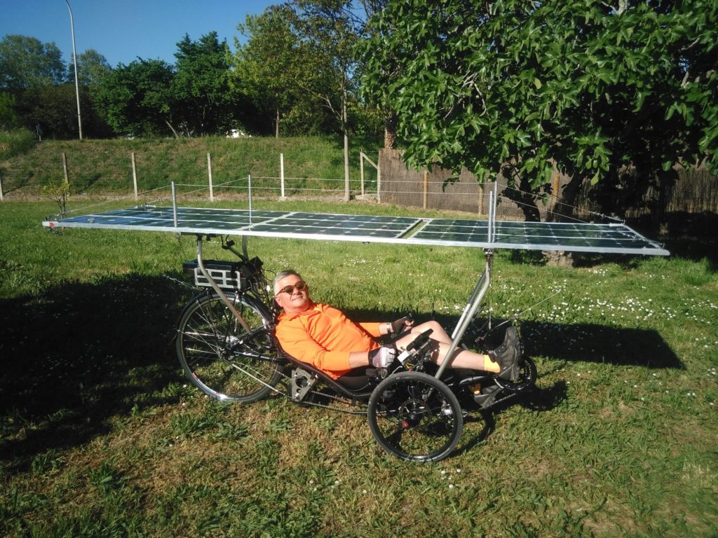 Il avait ensuite utilisé un vélo droit plus classique, avec la fameuse remorque Touzet.