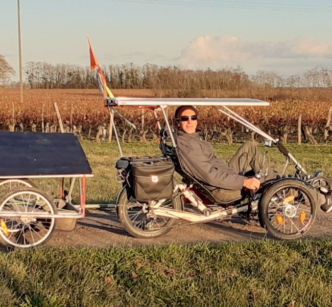 Il y a un an, je me suis acheté d’un trike couché, avec assistance électrique, que j’avais équipé d’un panneau solaire, en m’inspirant des vélos du Sun Trip (j’avais notamment aidé un concurrent à la préparation de son vélo pour le ST2021).