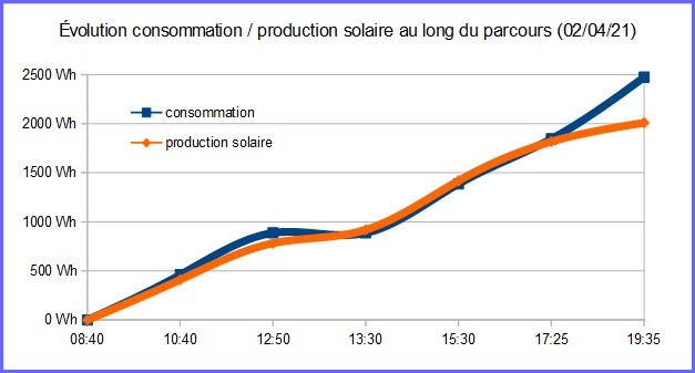 Lors des 2 sorties suivantes, j’ai corrigé le tir en augmentant la vitesse le matin et donc la consommation. Les temps d’arrêt sont en effet des moments de charge privilégiés où l’on peut orienter parfaitement les panneaux face au soleil.
