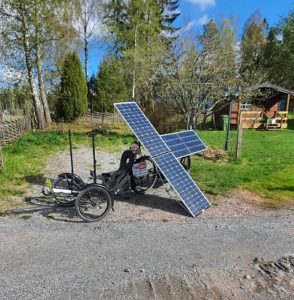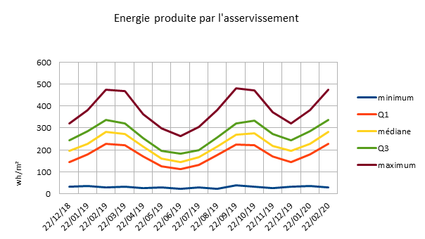 Les conclusions sont résumées dans la figure suivante. La production supplémentaire maximale se situe aux équinoxes. Il y a un minimum compréhensible en hiver. Le minimum secondaire d’été s’explique par le fait que nous simulons des randonnées entre 8h00 UTC et 16h00 UTC au moment où le soleil est haut dans le ciel, diminuant ainsi fortement l’intérêt d’un asservissement. La simulation d’une randonnée de 7h00 UTC à 17h00 UTC donne un gain d’énergie médian de 232 Wh/m². Des simulations sur une journée complète de 5h00 UTC à 19h00 UTC donnent un surplus d’énergie médian de 300 Wh/m². C’est supérieur à une randonnée de 8 heures au moment des équinoxes mais ce n’est toujours pas énorme.En résumé, sur une randonnée de 8 heures, on peut raisonnablement s’attendre à augmenter la production d’au moins 200 Wh par m² exposé en roulant. C’est équivalent à 1 heure de fort ensoleillement ( 1000 w/m²). C’est quantitativement important et cela peut justifier que l’on s’investisse dans le développement d’une solution technique.