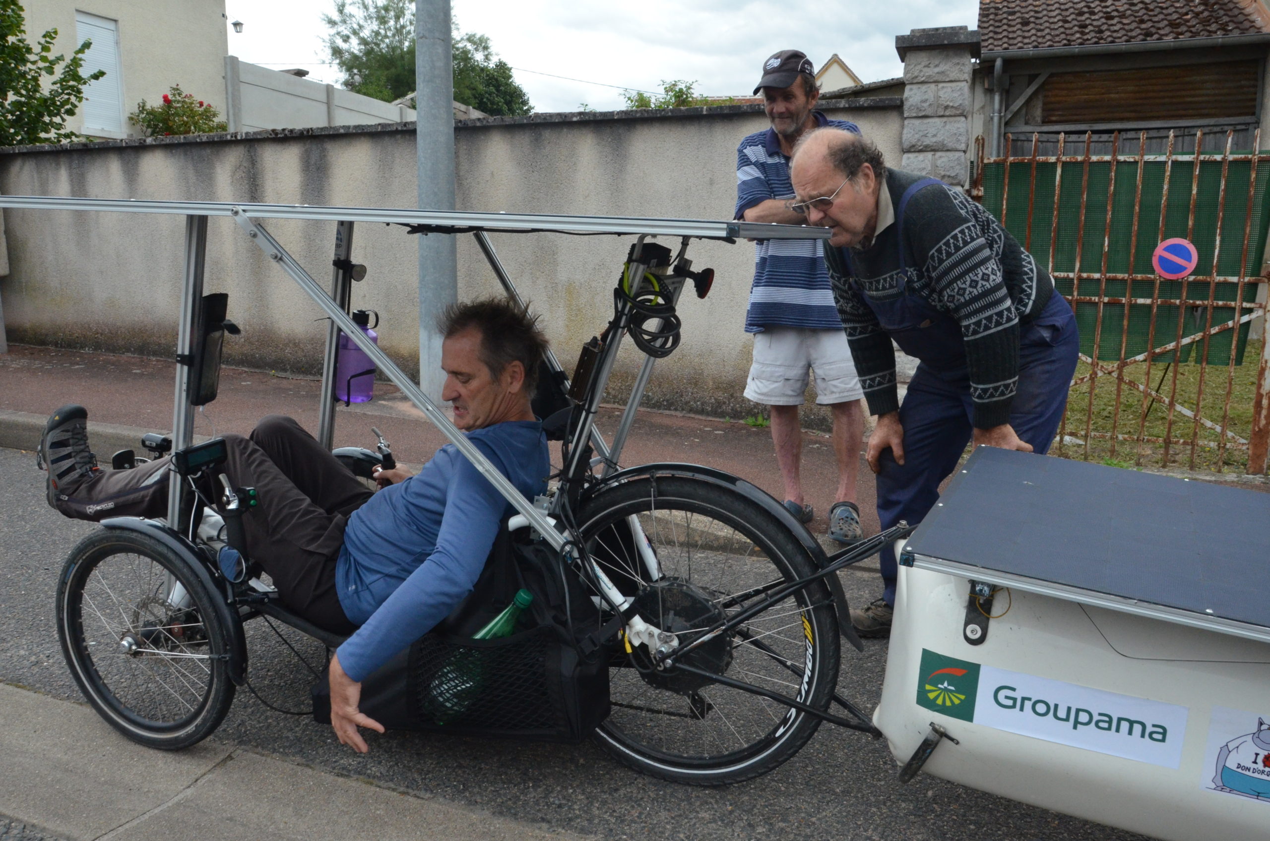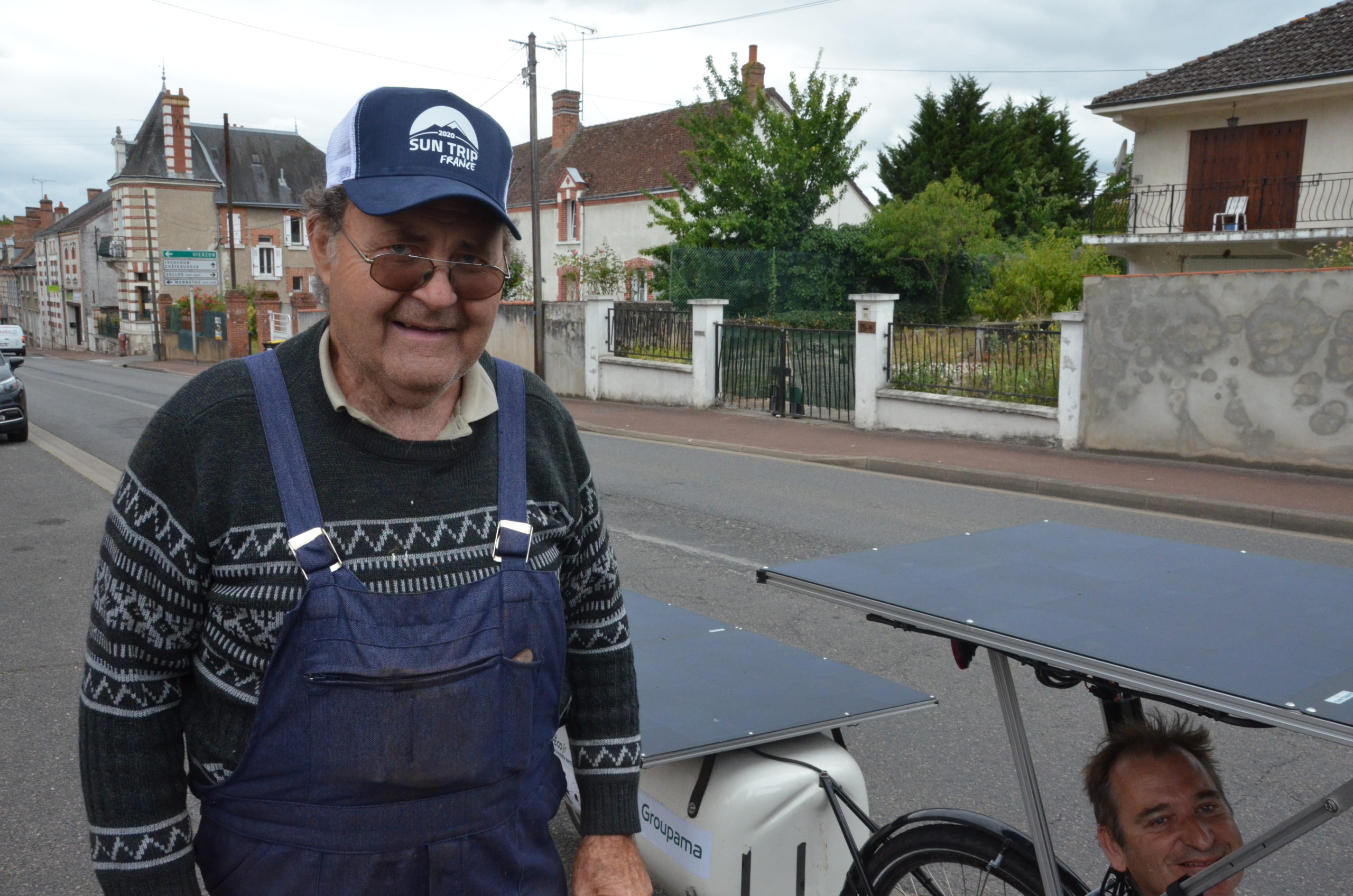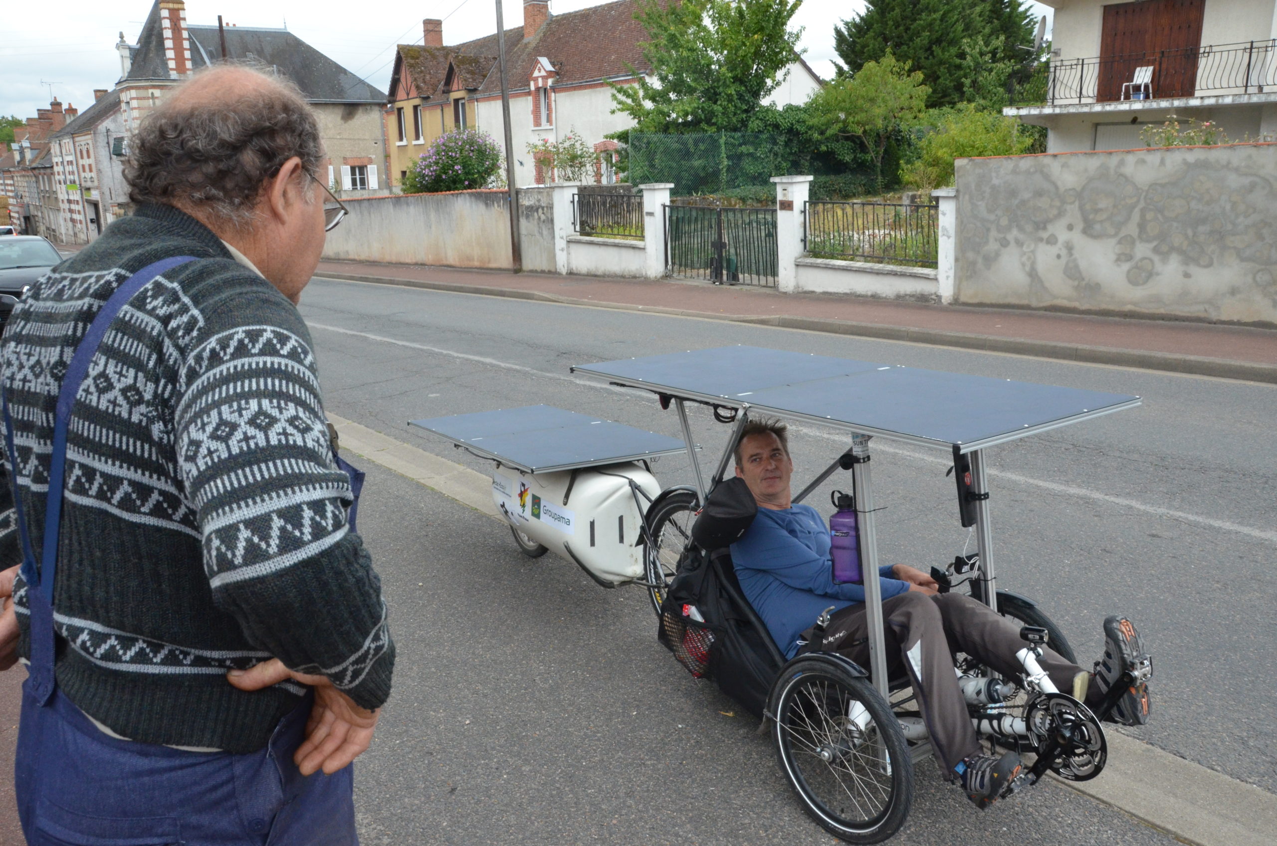 Parmi les belles rencontres de ce début de Sun Trip France, Monsieur Chat à Villefranche-sur-Cher. Un passionné d’électronique et d’énergies renouvelables. Quand le vélo solaire sert de prétexte pour se rencontrer et pour se parler. Ici avec Paul Baudry (Team Groupama).