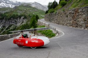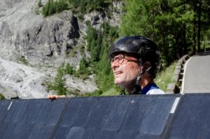 Mais le même jour Jean-Marc s’imposait un effort de presque 14 heures de route dans les vallées autrichiennes et italiennes, pour pouvoir dormir au pied du Stelvio et espérer prendre une éclaircie avant le mauvais temps annoncé. Au matin du 4 juillet, son plan se déroula comme par miracle, avec un soleil brillant dès 6h du matin, entre deux gros nuages. Il restait au camping jusqu’à 9h environ avant de partir à fond dans la montée. A mi-pente le soleil était encore présent. Il s’arrêtait pendant près de 2 heures pour capter un maximum d’énergie, avant que les nuages ne s’installent pour de bon. Au sommet il frise la surchauffe moteur, mais il passe, 24 heures exactement après Emil. Il sait qu’il pourra recharger ses batteries dans la descente, grâce à son moteur roue, et lance à son adversaire direct “Je suis pas mort, accroche toi Emil, rien n’est joué ! »