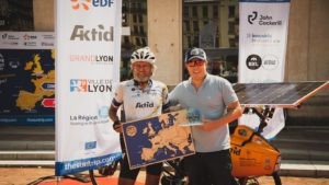 Car de son côté Emil a réalisé une performance incroyable à travers le massif central. Brive la Gaillarde – Lyon en un jour, c’est 350 km pour parachever son aventure et arrivée une heure avant l’heure limite du soir (avec laquelle il a trop souvent flirté durant l’aventure, soit dit en passant). Il ne pensait tellement pas y arriver que son frère, habitant Lausanne en Suisse, lui reprochera le lendemain de ne l’avoir pas prévenu d’une possible arrivée le même jour que Jean-Marc, auquel cas il aurait été là pour l’arrivée !