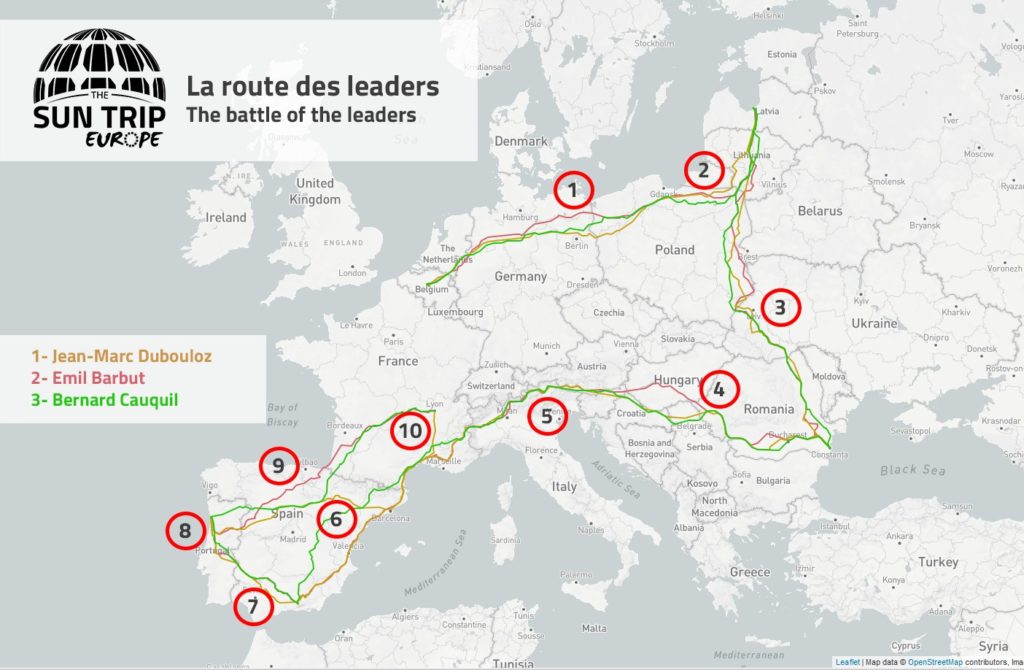 La course poursuite entre Jean-Marc Dubouloz, Emil Barbut et Bernard Cauquil aura certainement été le point fort de cette édition 2021 du Sun Trip. Jamais nous n’avions vu un tel niveau de performance, les 3 leaders faisant tous tomber les records des éditions passées. La moyenne journalière finale, de 280 km en 2015 et 2018, passe à 350 km pour les deux premiers, à 300 km pour Bernard. Le record de km en une journée, établi en 2018 à 427 km par Eric Morel, a été battu plusieurs fois, par Jean-Marc et Emil, avec des pointes à plus de 450 km entre 6h et 21h !
