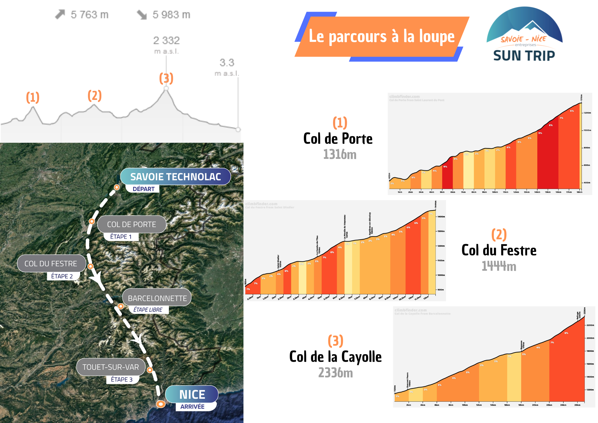 Ce parcours se veut un peu plus doux que celui proposé en 2023, où les participants devaient monter deux fois à plus de 2600 mètres d’altitude. Cette année le point culminant sera le col de la Cayolle et beaucoup des routes parcourues seront inédites sur le Sun Trip, notamment entre le Col de Porte et Barcelonnette.