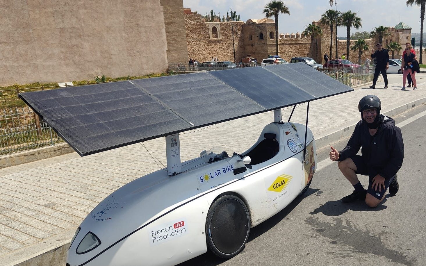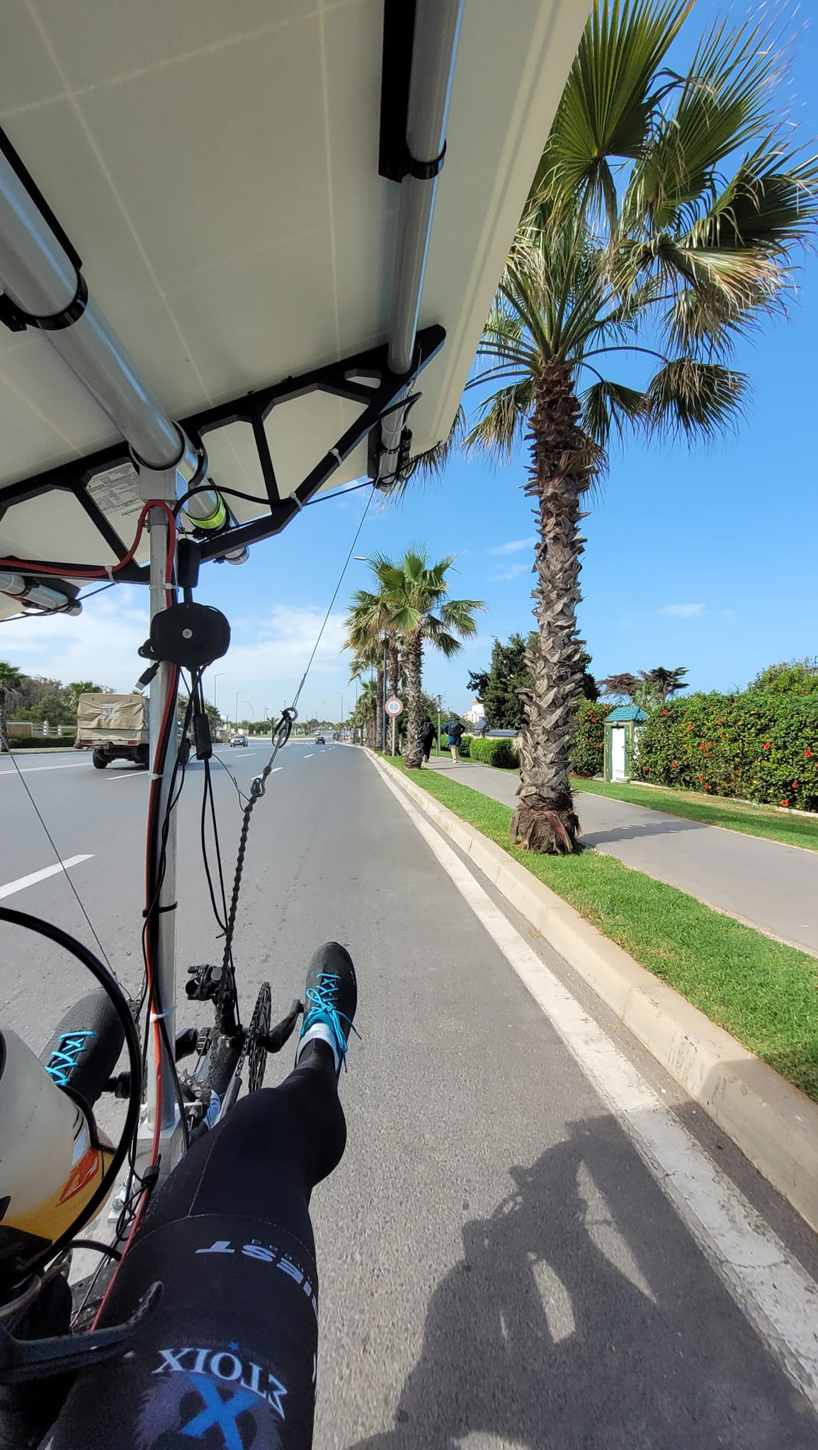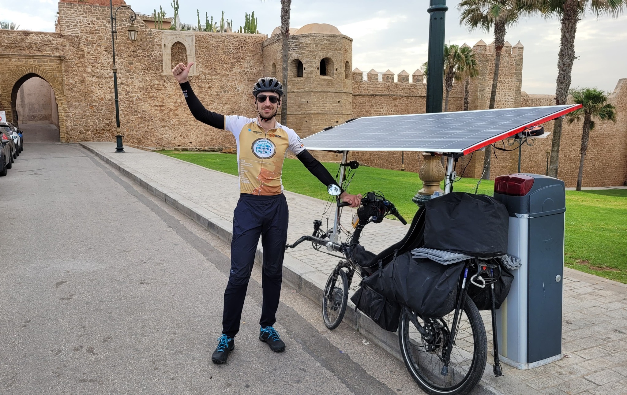 Dès 9 heures (heure marocaine) c’est Jack Butler qui ouvrait le bal, en passant devant la Kasbah des Oudayas, le checpoint 3 de l’aventure. 4 heures plus tard c’est Jean-Marc Dubouloz qui passait dans la capitale du Maroc. Les deux leaders retrouvaient ici le soleil après une journée de pluie hier. Puis progressivement le vent a soufflé dans le dos et les aventuriers ont roulé toute la journée ! L’écart a fluctué entre 60 et 90 km. Au soir de cette 11ème journée de route, au terme de 316 km de route, Jack Butler a environ 92 km d’avance. Jamais il a eu une telle avantage sur Jean-Marc Dubouloz. Le français résiste bien, au grè de quelques arrêts chez des garagistes pour arranger petit à petit son vélo après la chute connue dans le sud de l’Espagne. A ce jour on ne sait pas s’il va faire une réparation sur ses panneaux solaires, en se faisant envoyer du matériel depuis la France (ce qui est autorisé).
