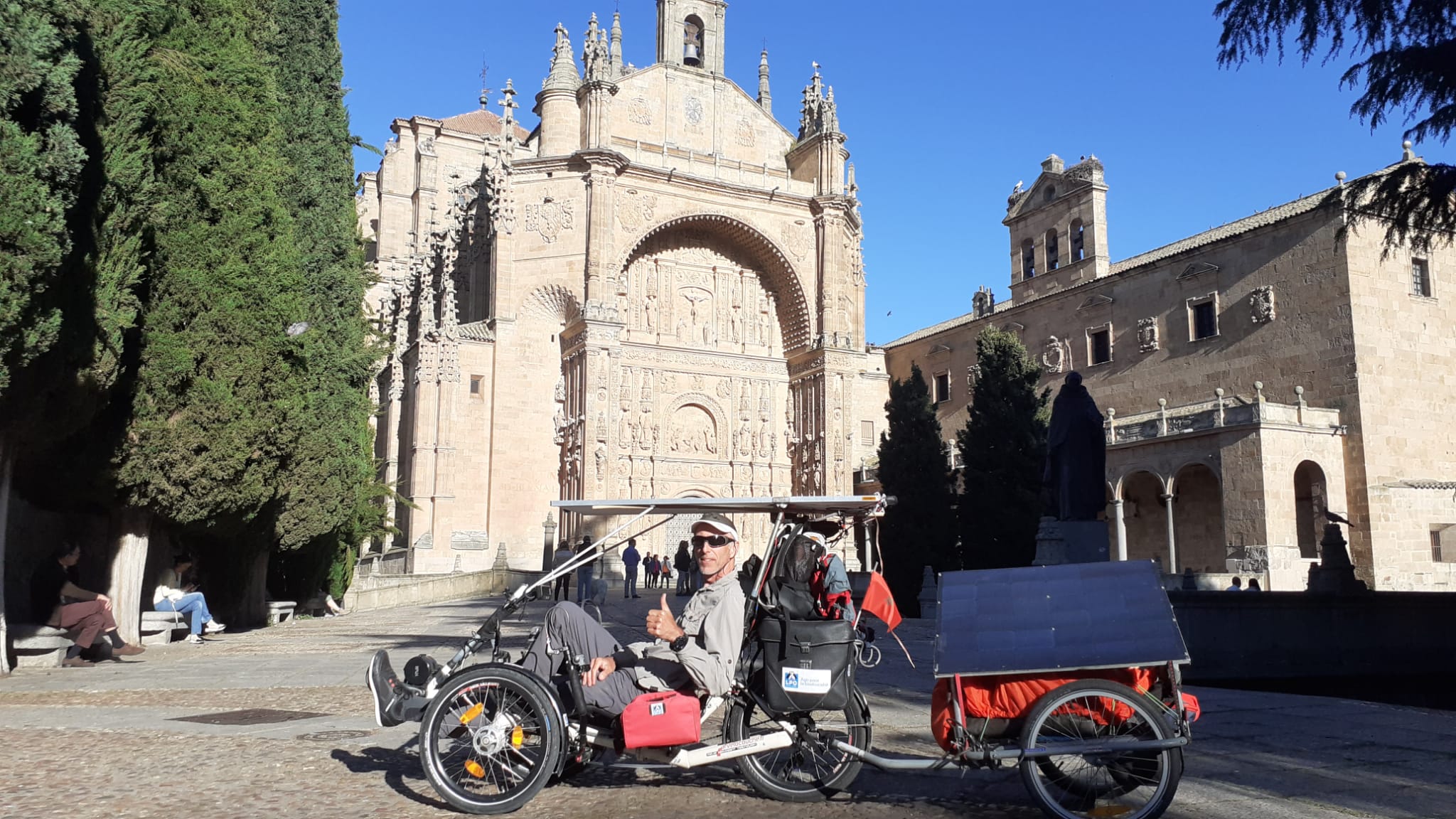 Vincent Lauga : « A l’hôtel (proche du centre de Salamanca) la réceptionniste souhaitait que je descende le vélo dans le local en sous sol, mais comme il ne rentrait pas dans l’ascenseur elle a dit de le faire par l’escalier, et qu’elle allait m’aider (et pourtant elle avait vu le vélo)! J’ai dû dire que je partirai tôt demain pour qu’elle soit d’accord que je le laisse dans la cour.«