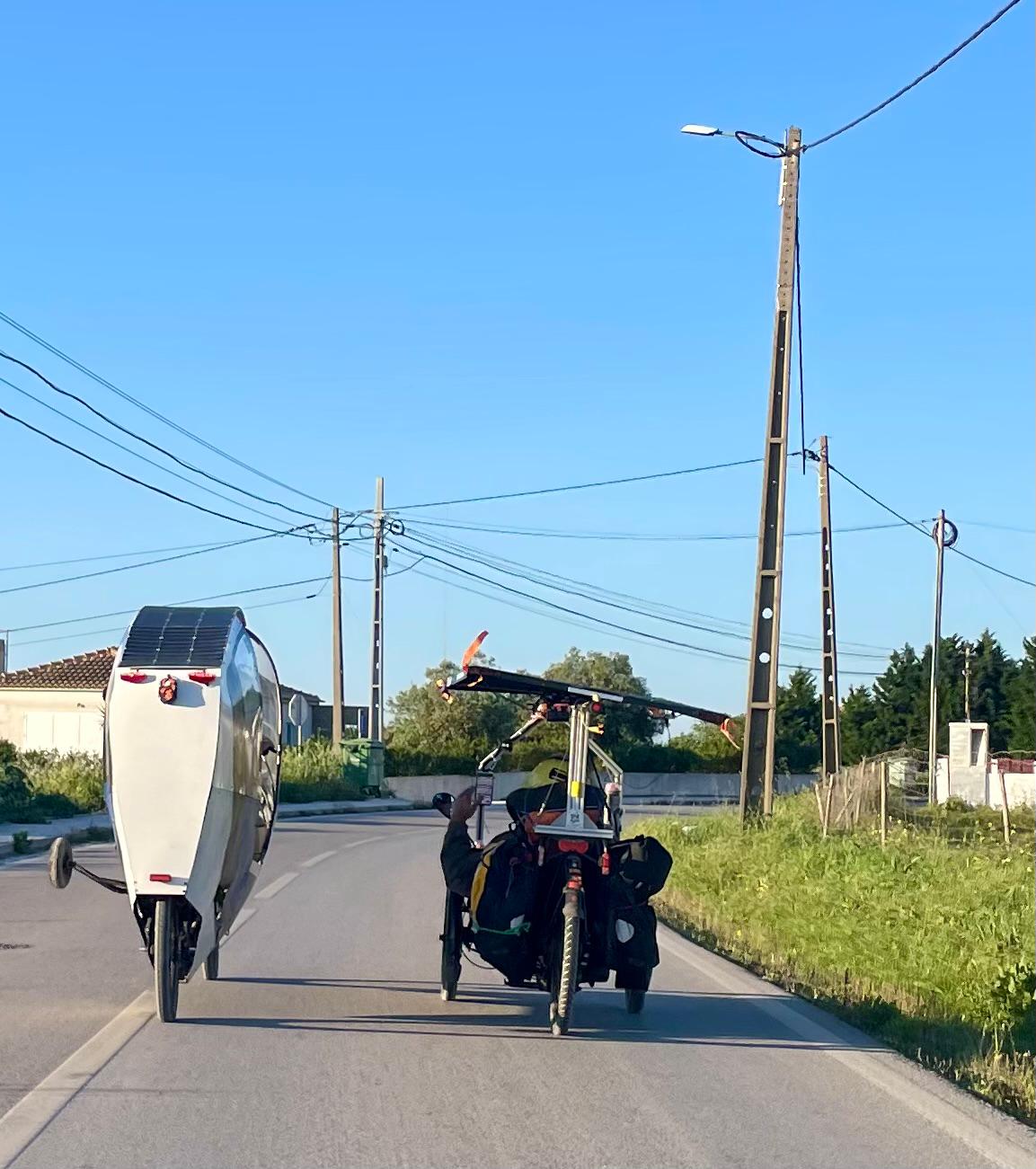 Jean-Louis Mérelle : « j’ai eu 2 contact positif avec la police aujourd’hui.. une dame policière s’est arrêté pendant que je rechargais au soleil tout sourire et me demande si elle peut prendre mon engin en photo, « no problem » je lui réponds et après discussion elle repart en me souhaitant bonne chance ! Un autre policier en moto . Je roulais, il s’est mis à ma hauteur en regardant mon engin,il lève le pousse pour dire « chouette » et continue sa route.. ils ne sont pas tous mauvais. Il n’y aurait pas eu un truc aux infos pour nous ? »