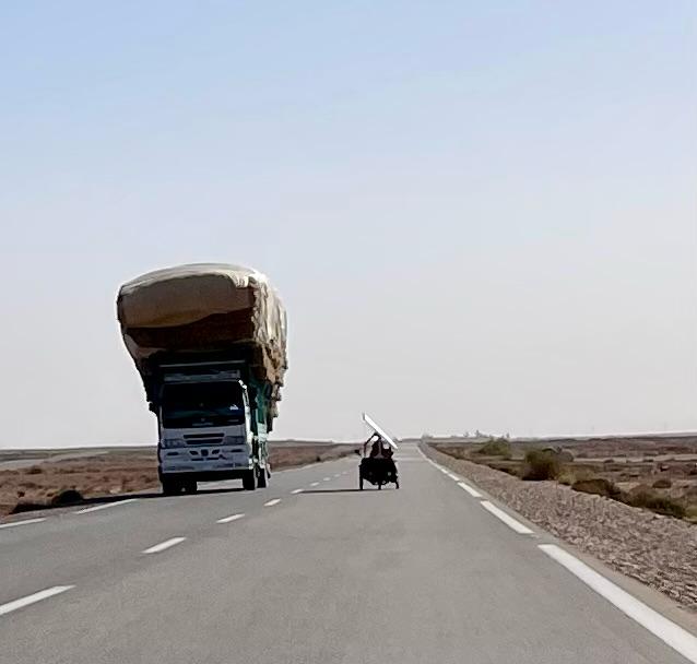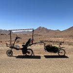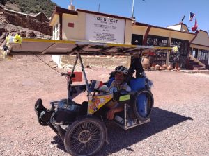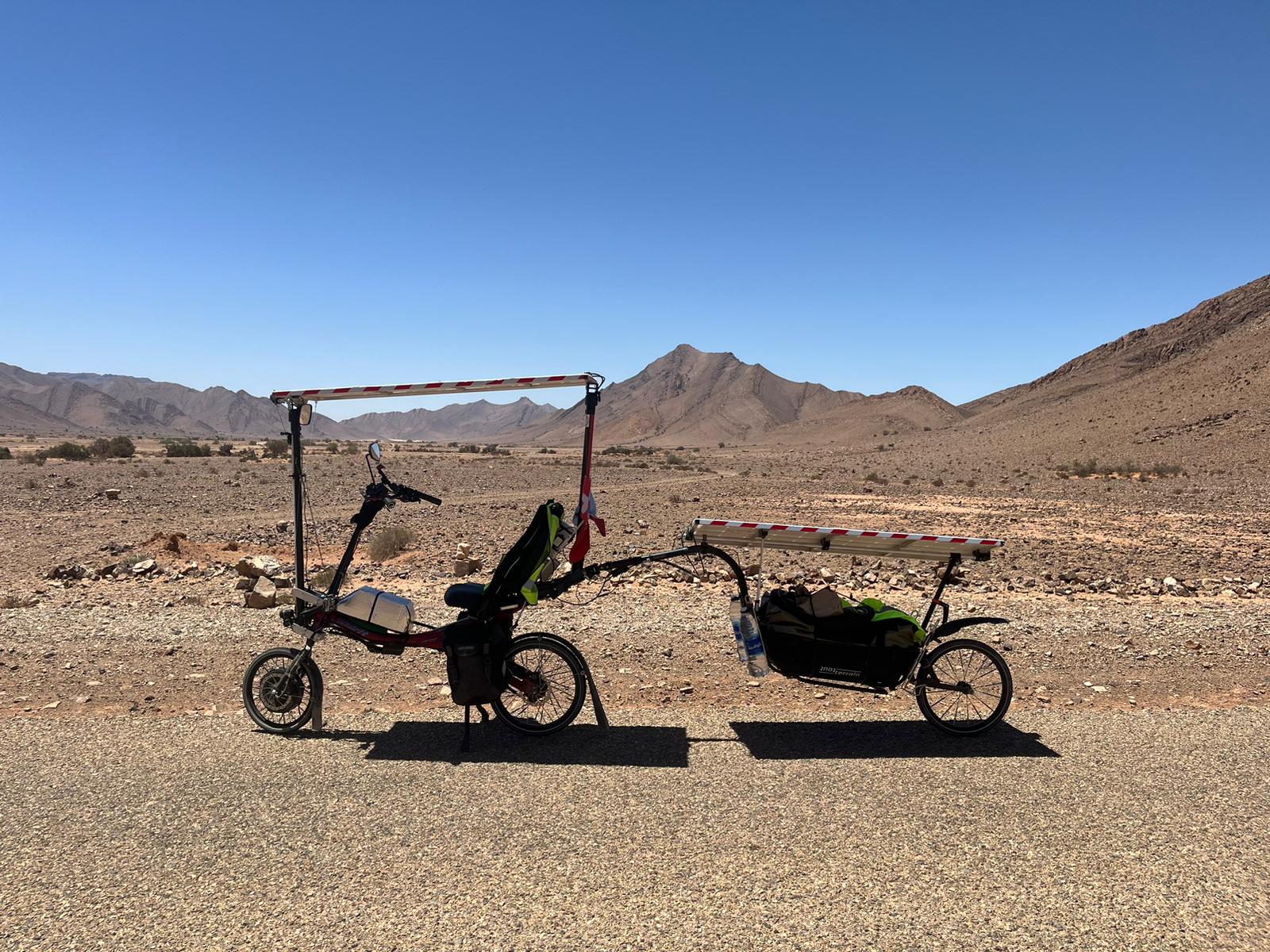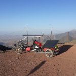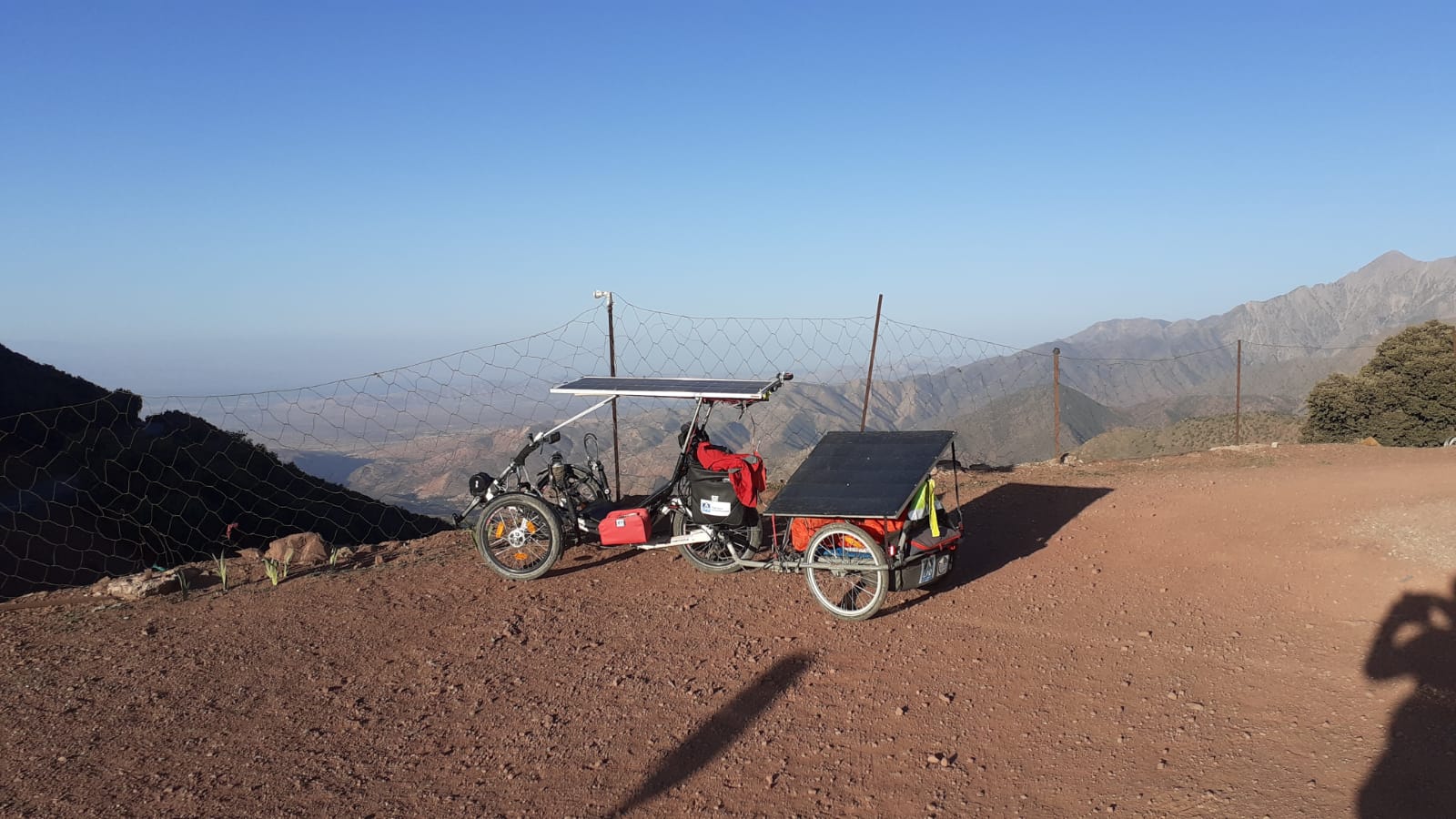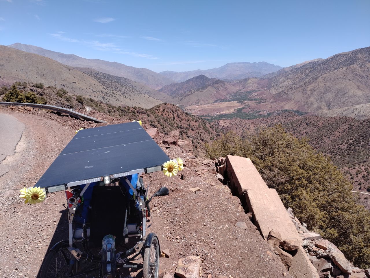 Jean-Louis : Mes batteries ne sont pas très remplies depuis ce matin. J’oscille entre 40 et 30% jouant avec l’énergie reçu des panneaux. En effet quand mes panneaux fournissent 330 W à mes batteries, je ne tire que 280 W pour mes moteurs. Je peux ainsi me targuer de dire que je charge mes batteries en montant Tizi N’test … Puis enfin le Col arrive au bout d’une route sommitale presque plate. Un restaurant trône au Col et c’est naturellement que je mis engouffre. J’attendais ce moment impatiemment. J’avale une bonne omelette aux poivrons et autres crudités, excellente ! Après une heure le cycliste et le vélo sont bien rechargés, il est temps de s’asseoir dans sa chaise longue que constitue mon vélo couché. » La suite sur son Polarsteps.